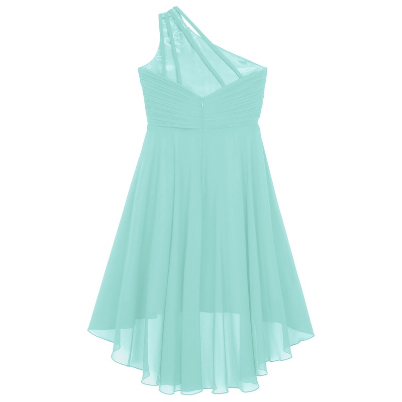 Shiny beaded adorns on shoulder, high-low chiffon skirt, ruched bodice and twisted knot, making your girl look elegant and charming.