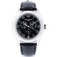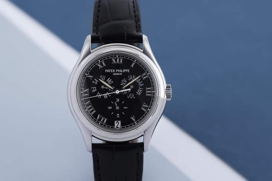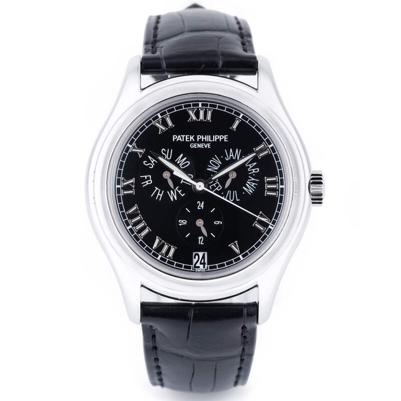 Pre-owned, excellent condition Patek Philippe Annual Calendar reference 5035 Platinum gents wristwatch. Black dial, applied Roman numeral hour markers, date display at 6 o'clock, month display at 3 o'clock, 24 hour am/pm display at 6 o'clock, day display at 9 o'clock, a Platinum 37mm case, smooth bezel, winder and classic pin buckle, an unworn Patek Philippe black leather strap, sapphire crystal glass and automatic movement.