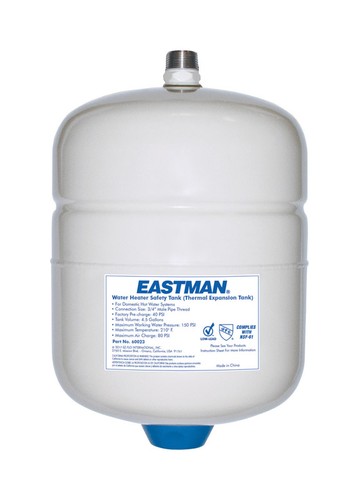 Eastman thermal expansion tanks are designed to prevent backflow from residential water heaters. The tank is for 30 gal. to 160 gal. Maximum working pressure 150 PSI and maximum operating temperature is 210 degree Fahrenheit.