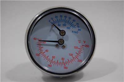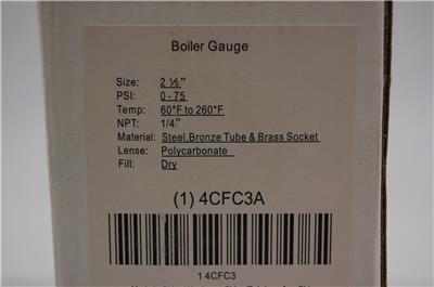 Description: This listing is for a new 4CFC3A Round Boiler Gauge 0 to 75 psi, 60° to 260°F 2-1/2in Dial 1/4in NPT Male