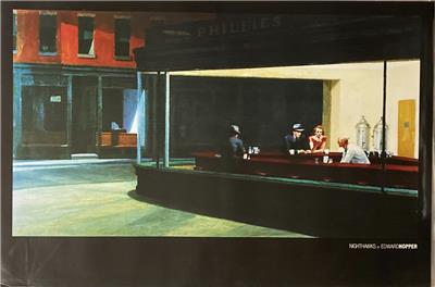 This poster features late night diner scene as imagined by artist Edward Hopper.