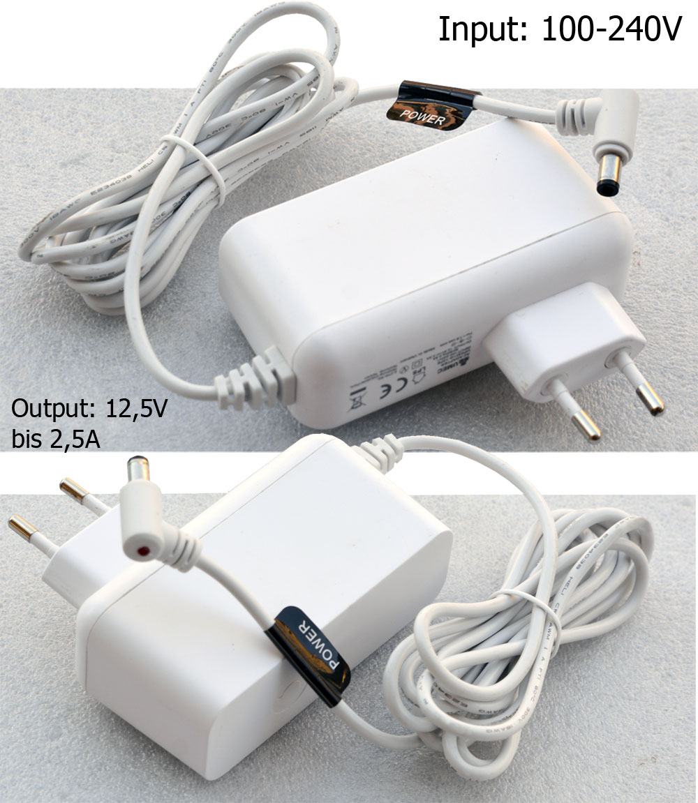 Ausgang: 12,5V bis 2,5A, Stecker: 5,5 x 2,5 mm, unter dem Last 12V