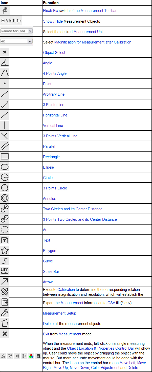 - The Measurement Toolbar will pop up when moving mouse cursor to any place near the upper edge of the video window. Here is the introduction of the various functions on the Measurement Toolbar
