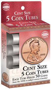 Built with a twist-off cap, these archival-quality coin tubes come in a quantity of five and are made of stay-clear, acid-free plastic. Cent size Whitman round coin tubes hold every U.S. cent minted from the 1850's to date.
