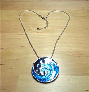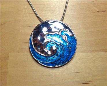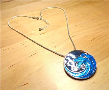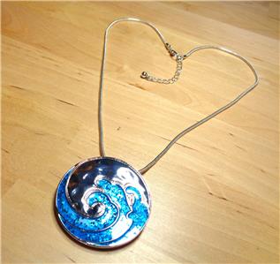 BEACH FASHION AQUA BLUE OCEAN WAVE SILVER TONE RHODIUM PENDANT NECKLACE