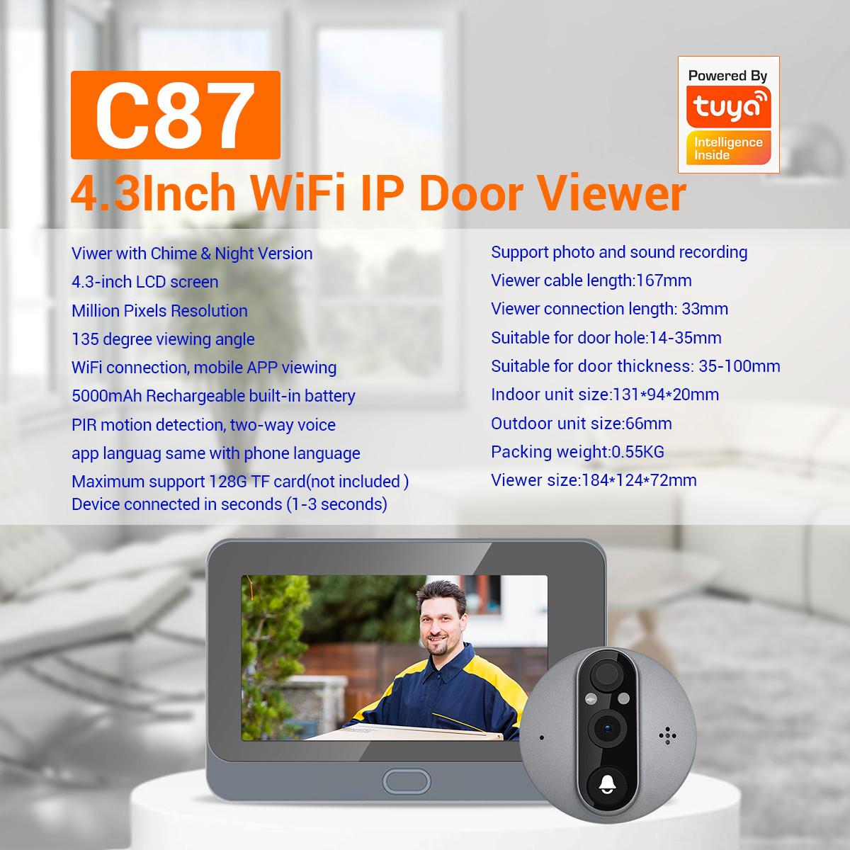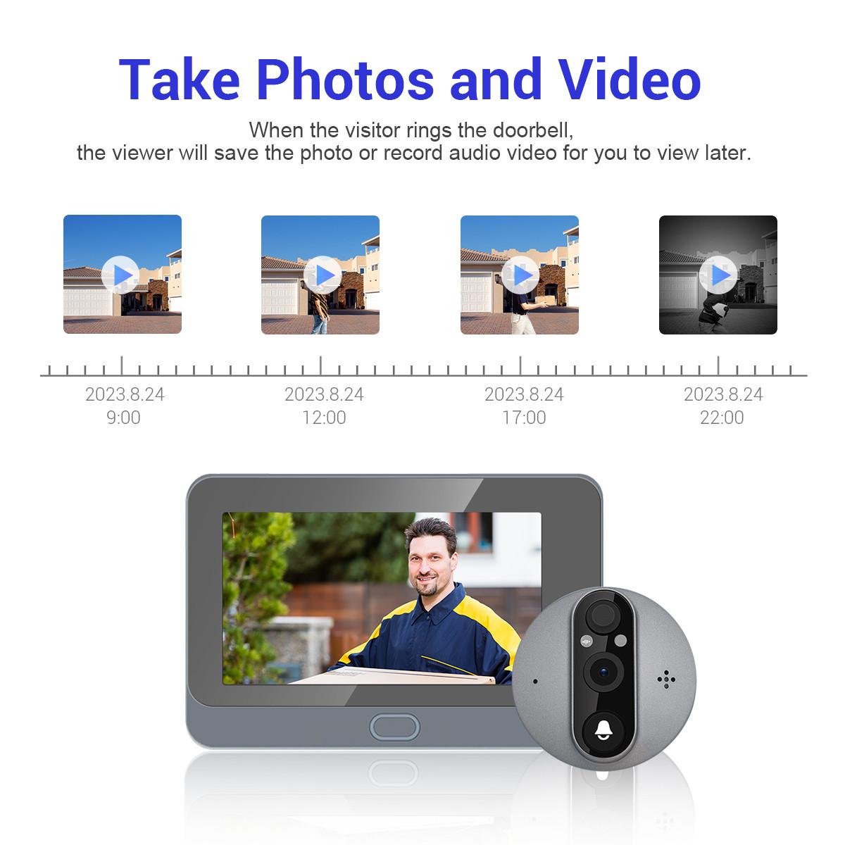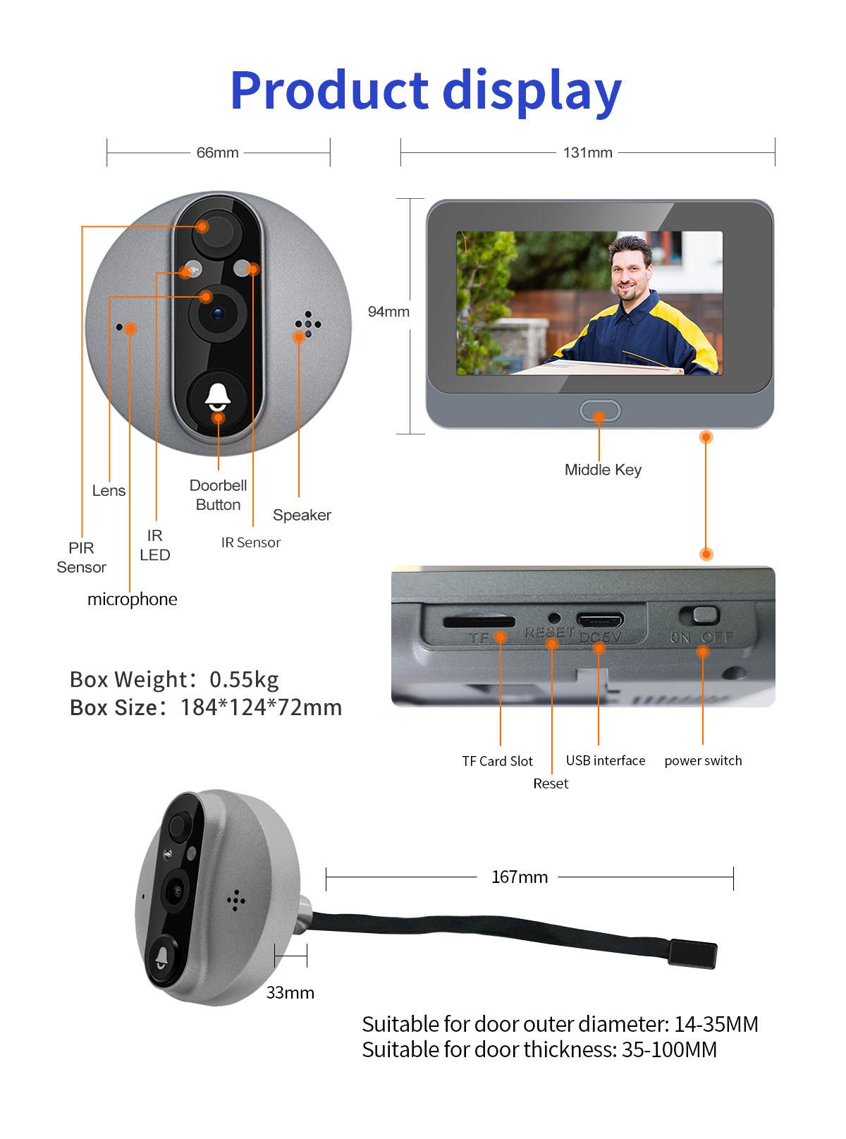 | Screen size: 131*94*20mm Doorbell:73(L)*65(W)*53 (H) mm Storage:Mobile phone memory:Yes, SD TF Card:8-128GB(Not include) Cloud Function: Yes Other Feature: Weatherproof: Yes User Accounts: Total 4 Users (Admin user and normal user) |