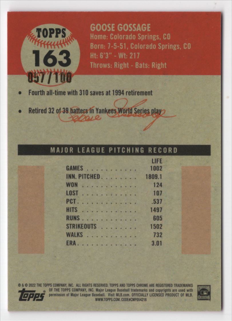 | 2022 TOPPS CHROME PLATINUM PINK TOILE /100 Goose Gossage Yankees #163 | ||||||||||||||||