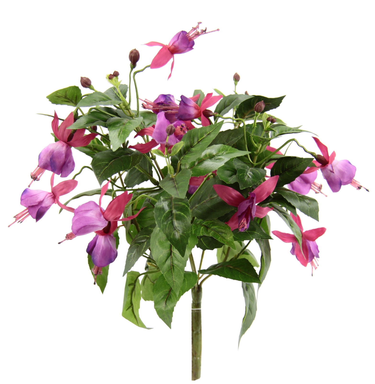 Künstliche Fuchsie, zweitriebig mit Blüten, Knospen und Blattwerk. Die Anordnung der Blütenköpfe und Knospen erfolgte hängend, der Natur nachempfunden. Dieser künstliche Fuchsien Zweig ist eine beliebte, saisonale Kunstblumen Dekoration in Blumenampeln oder Blumen- und Balkonkästen.
