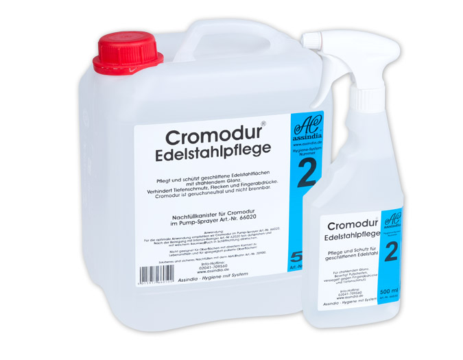 Nach der Reinigung mit Intensiv-Reiniger wird Cromodur fein und gleichmäßig aufgesprüht. Durch den Micro-Feinsprayer ist Cromodur besonders sparsam zu dosieren. Die Edelstahl-Oberfläche wird anschließend mit einem weichen Wolltuch in Schliffrichtung nachpoliert. Wenn die Oberfläche trocken aussieht, ist die optimale Schutz- und Pflegeschicht aufgebracht.