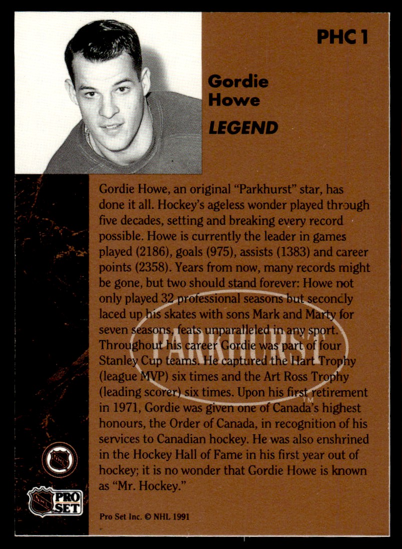 | 1991-92 Parkhurst Collectibles Gordie Howe Detroit Red Wings #PHC1 R27 | ||||||||||||||||||