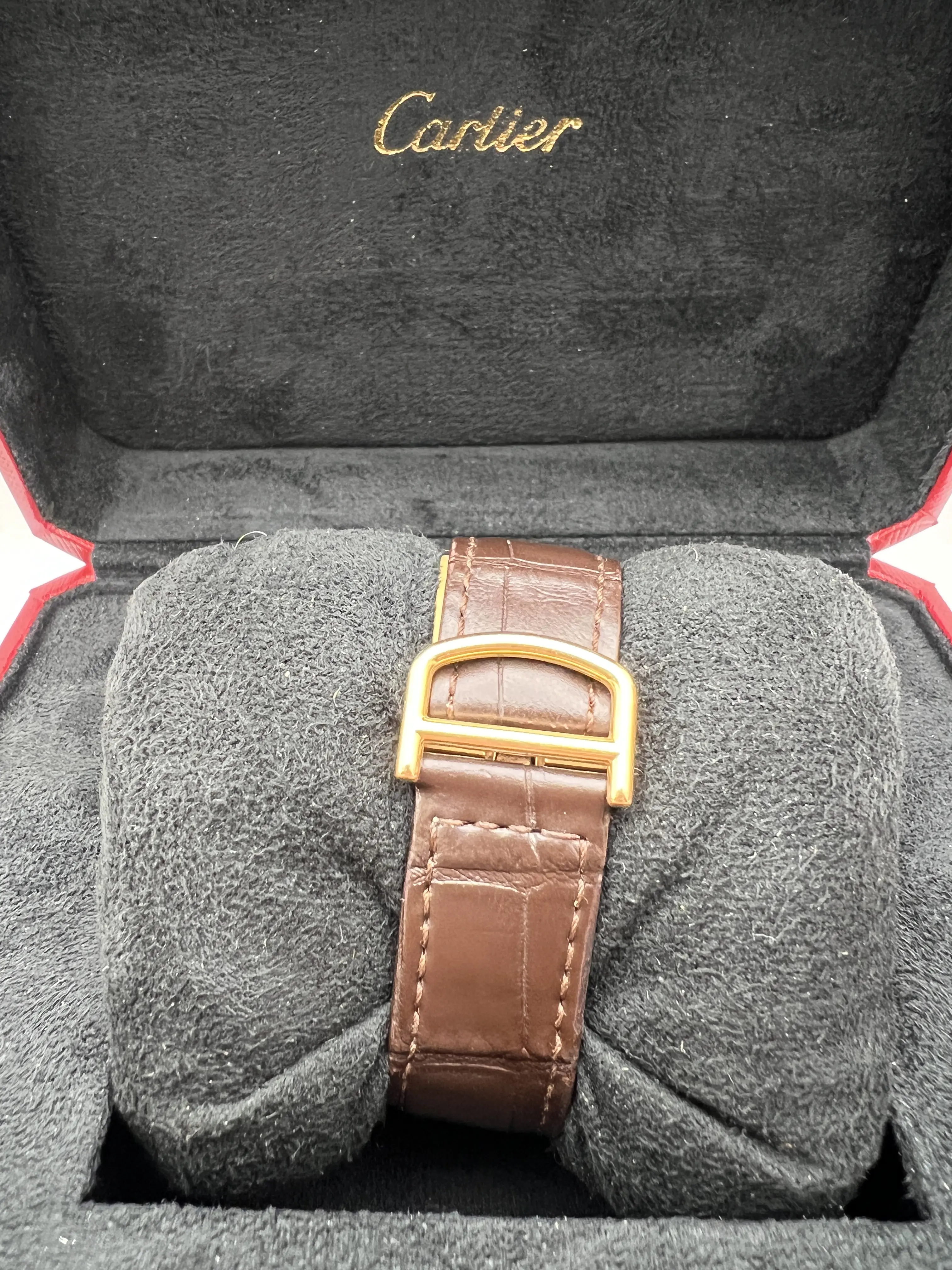 Cartier Ronde Louis XL 42mm 18K Rose Gold Case, Factory Diamond Bezel, Brown Alligator Strap, Silver Flinque Dial with Blue Hands and seconds subdial, white sapphire cabochon on crown, 18K Rose Gold Deployant Buckle, reference WR007001. Watch is in excellent condition and comes with Cartier Box and 1 year seller warranty.