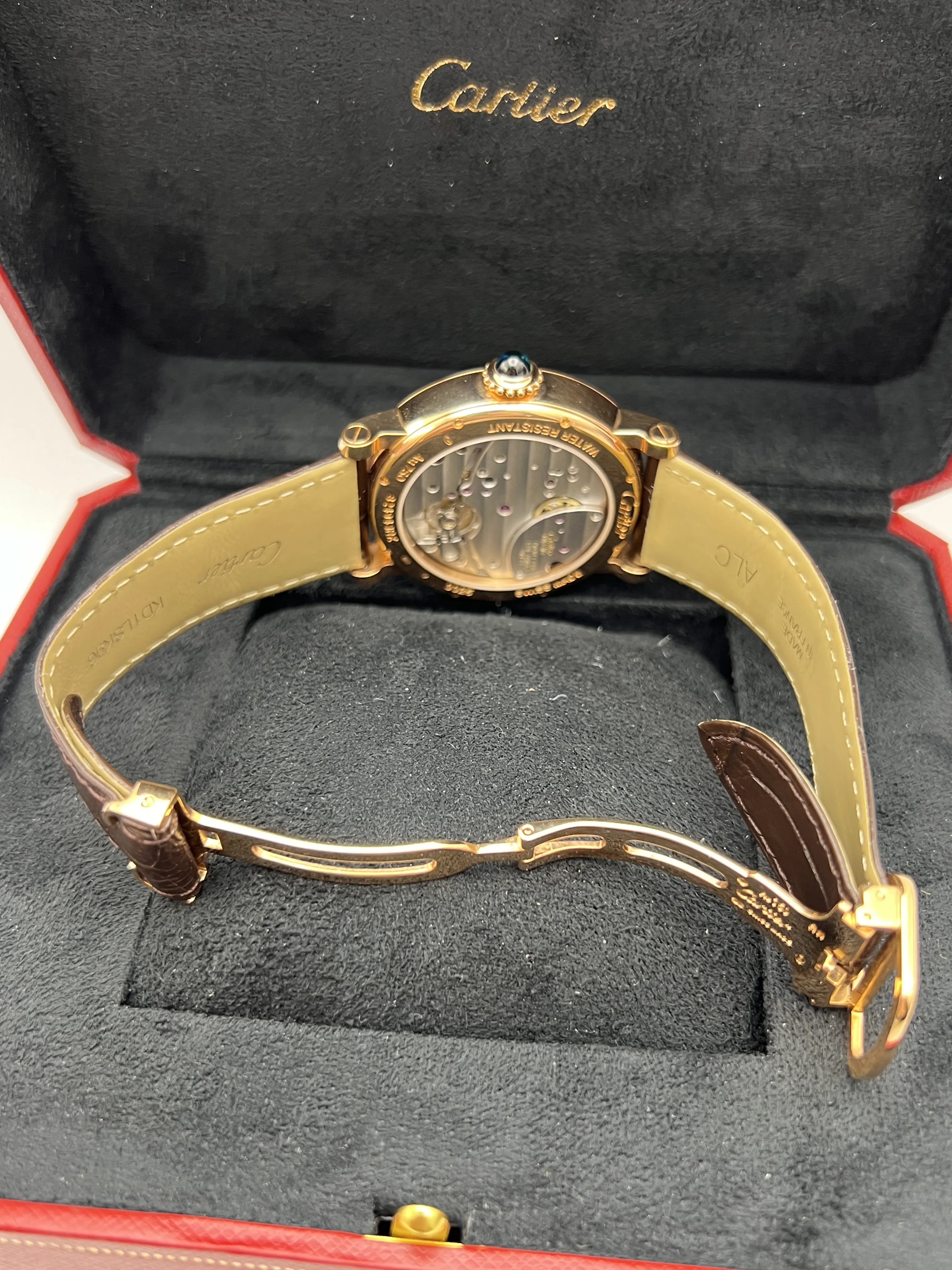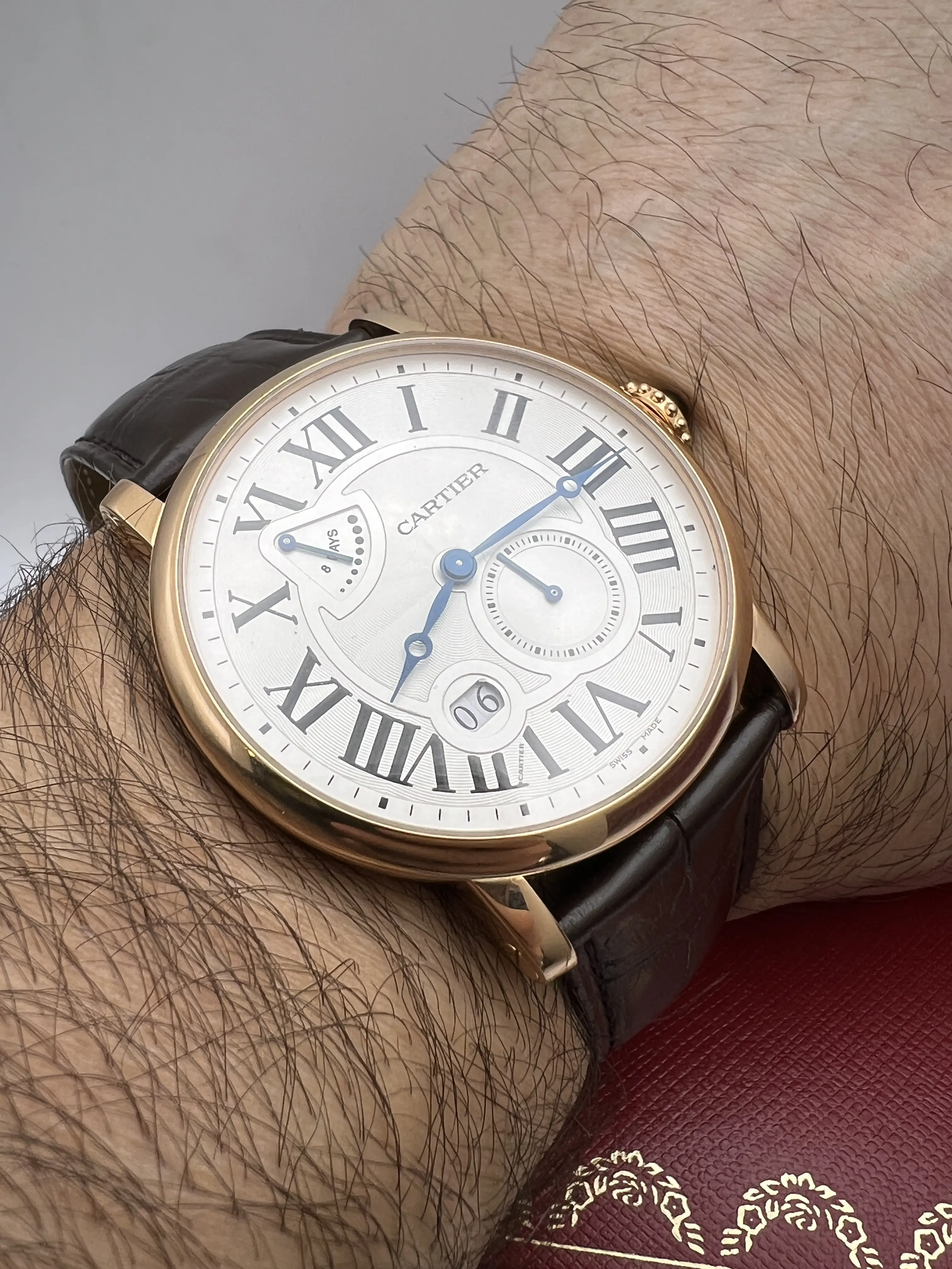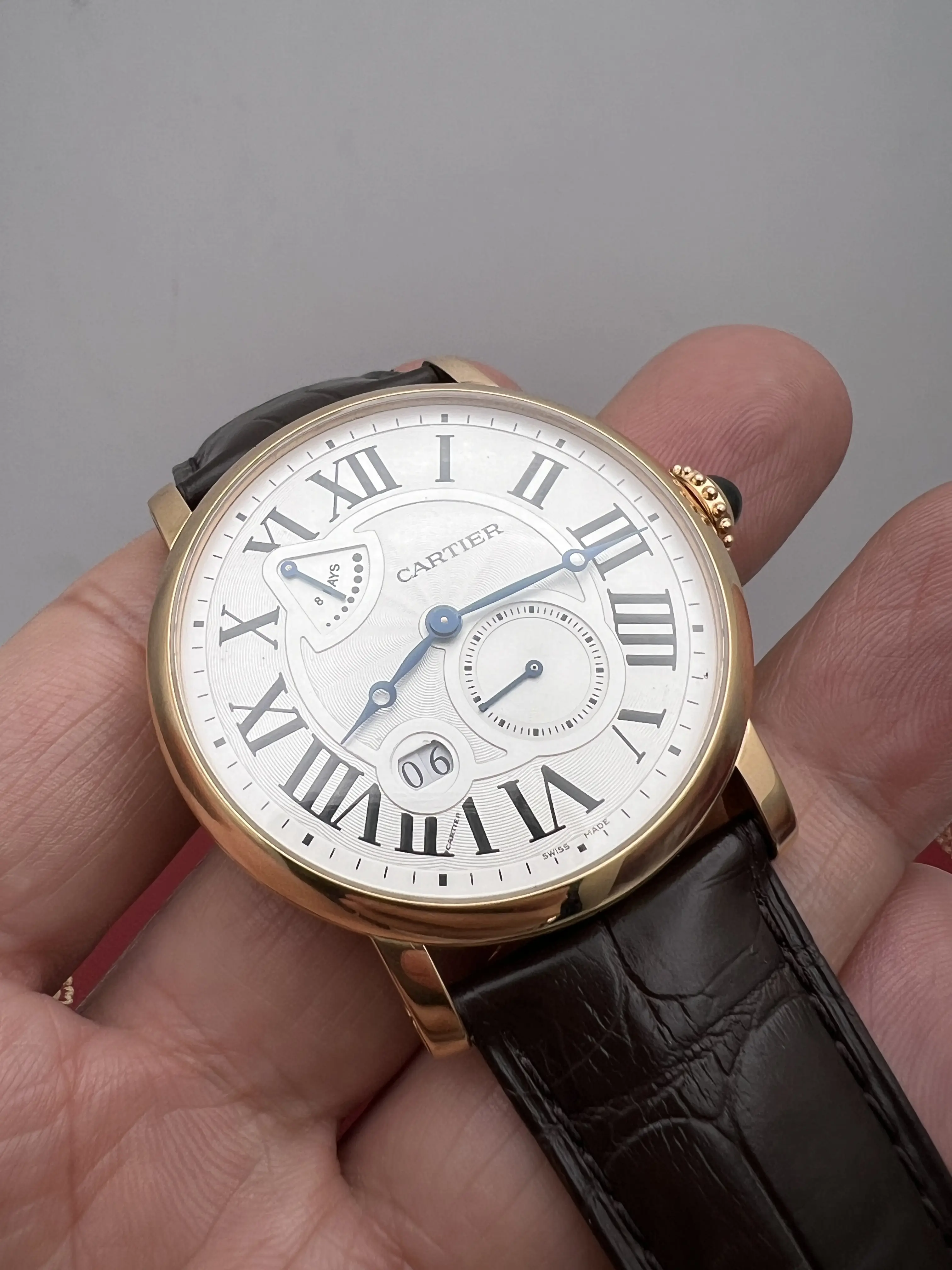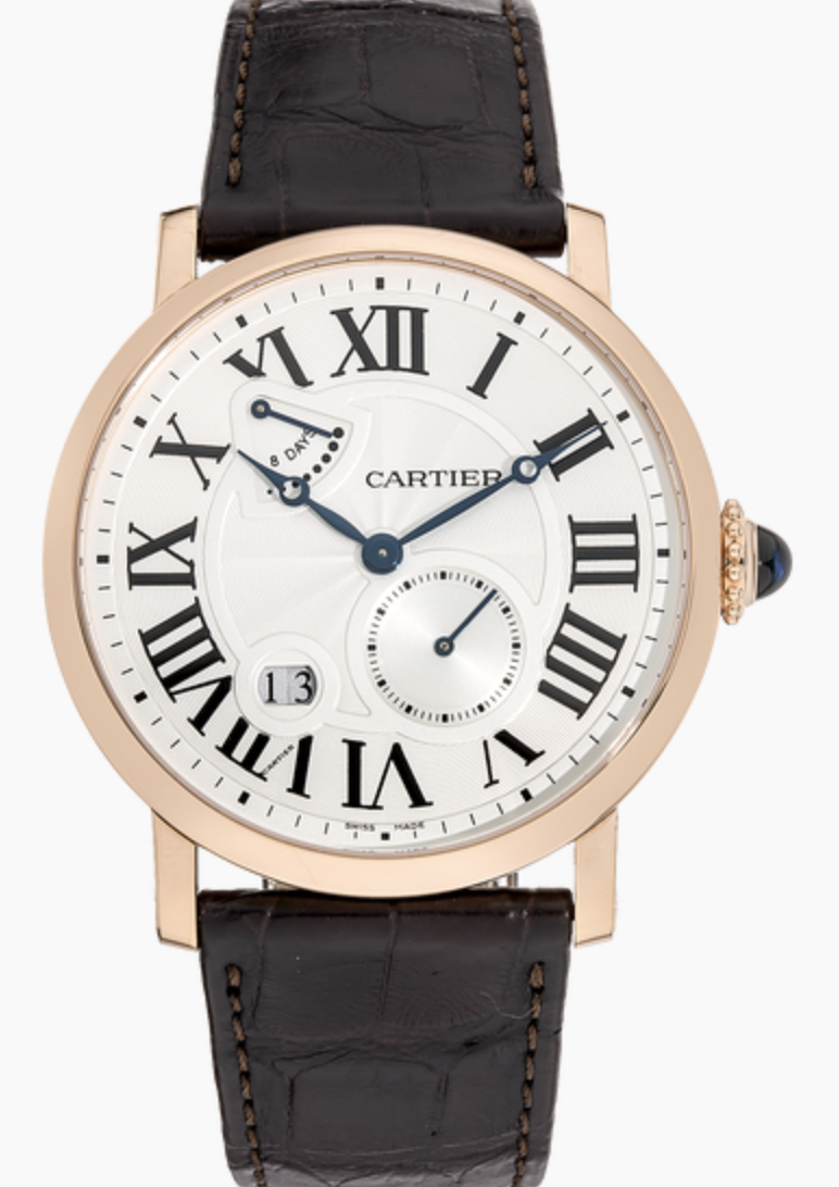 Cartier Rotonde, Manual Hand Wind Movement, 42mm 18K Rose Gold Case, Brown Alligator Leather strap, Silver Guilloche Dial with Blue Hands, 8 Day Power Reserve Indicator, small second hand Subdial, Roman Numeral Markers with date window, exhibition case back, Mens Watch reference W1556203. Watch is in excellent condition and comes with Original Cartier Box and 1 year seller warranty.