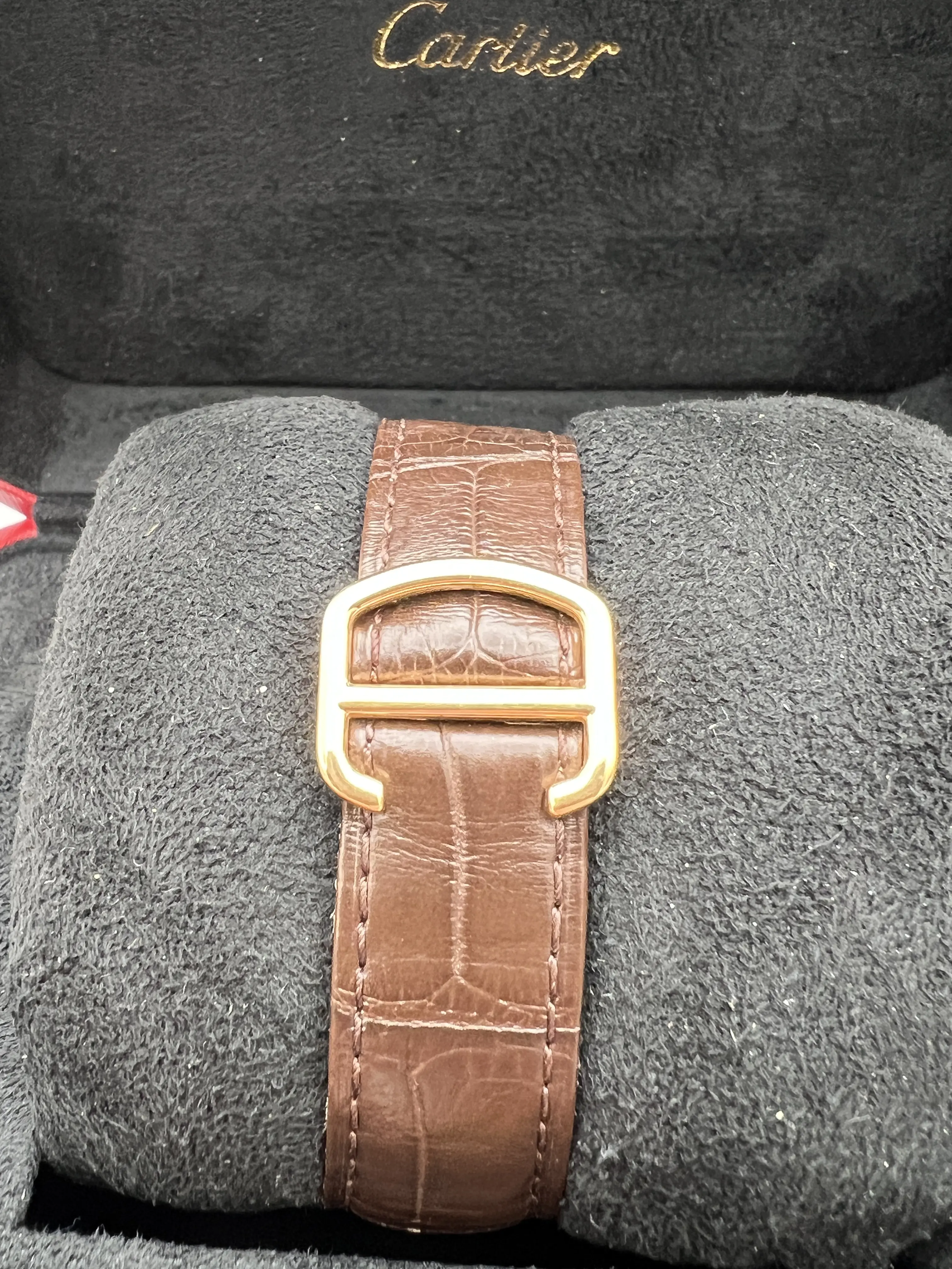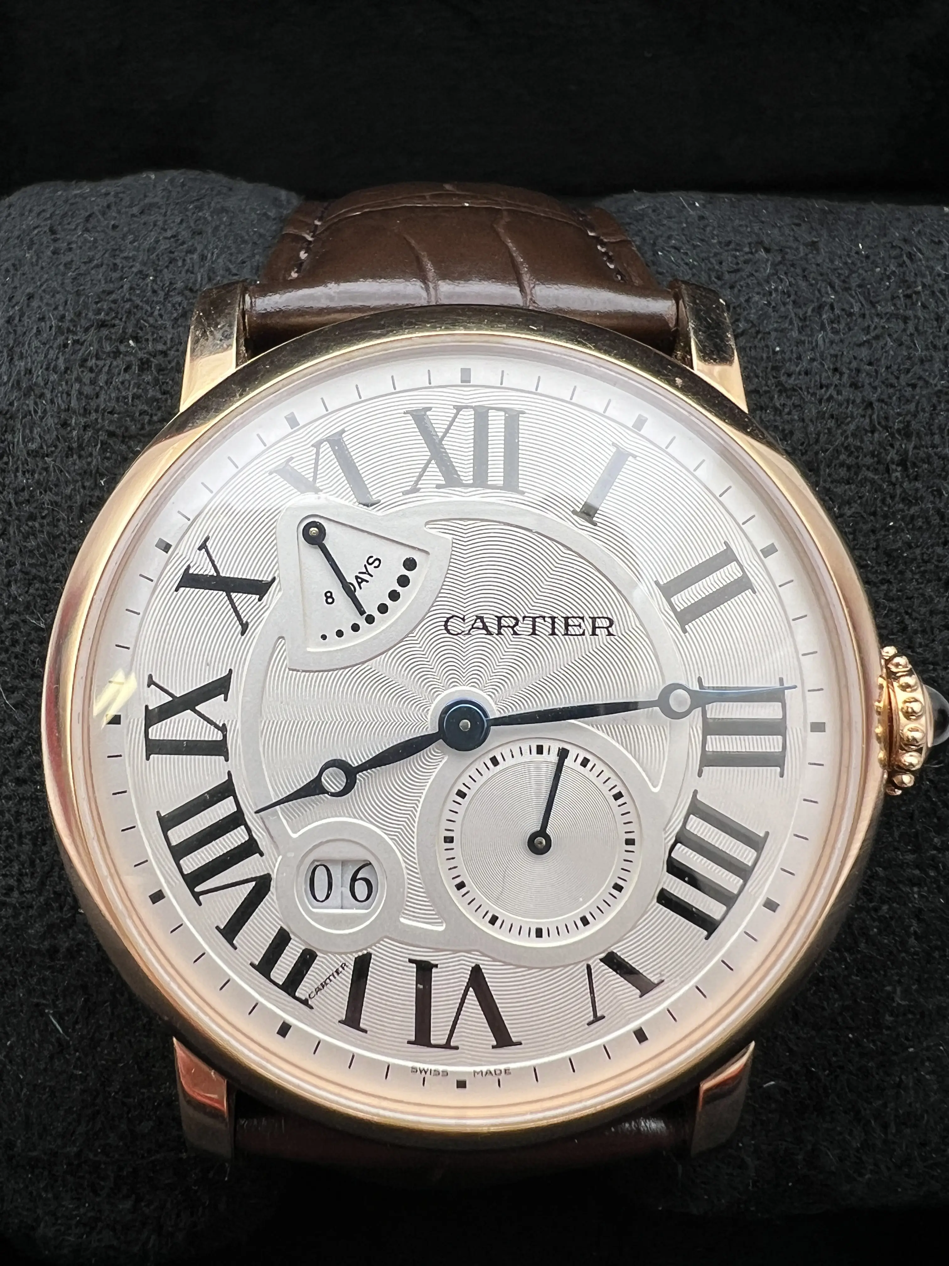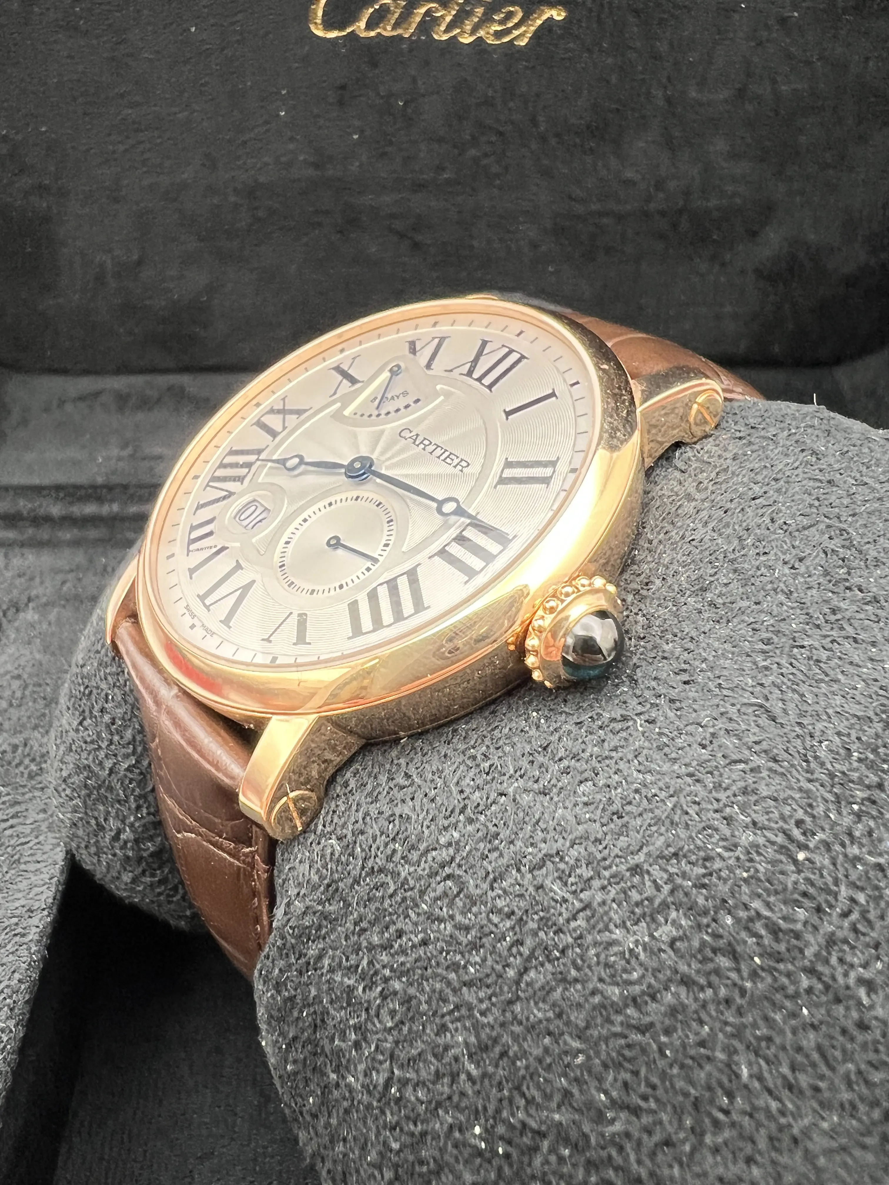 Cartier Rotonde, Manual Hand Wind Movement, 42mm 18K Rose Gold Case, Brown Alligator Leather strap, Silver Guilloche Dial with Blue Hands, 8 Day Power Reserve Indicator, small second hand Subdial, Roman Numeral Markers with date window, exhibition case back, Mens Watch reference W1556203. Watch is in excellent condition and comes with Original Cartier Box and 1 year seller warranty.