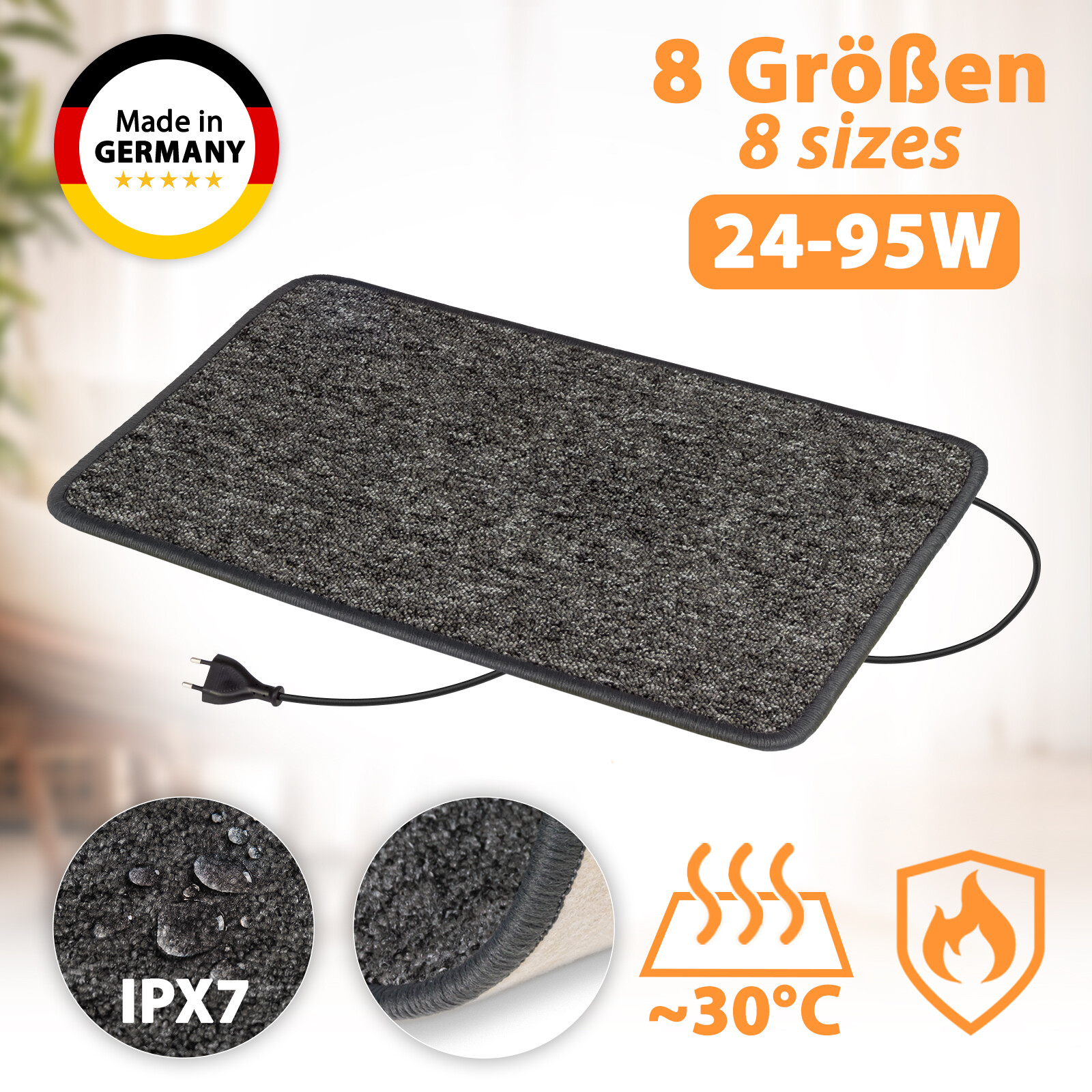 Tappeto di riscaldamento di alta qualità con interruttori del piede. Il tappetino di calore ha una potenza di 100 watt e raggiunge una temperatura superficiale di circa 40 ° C +/- 10%. Inoltre, il tappeto di riscaldamento è dotato di un interruttore di temperatura di sicurezza integrato.