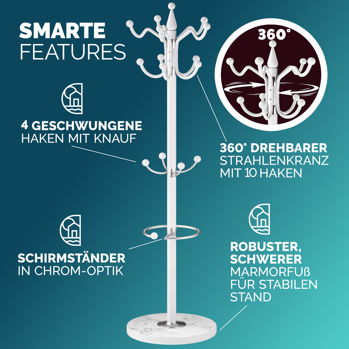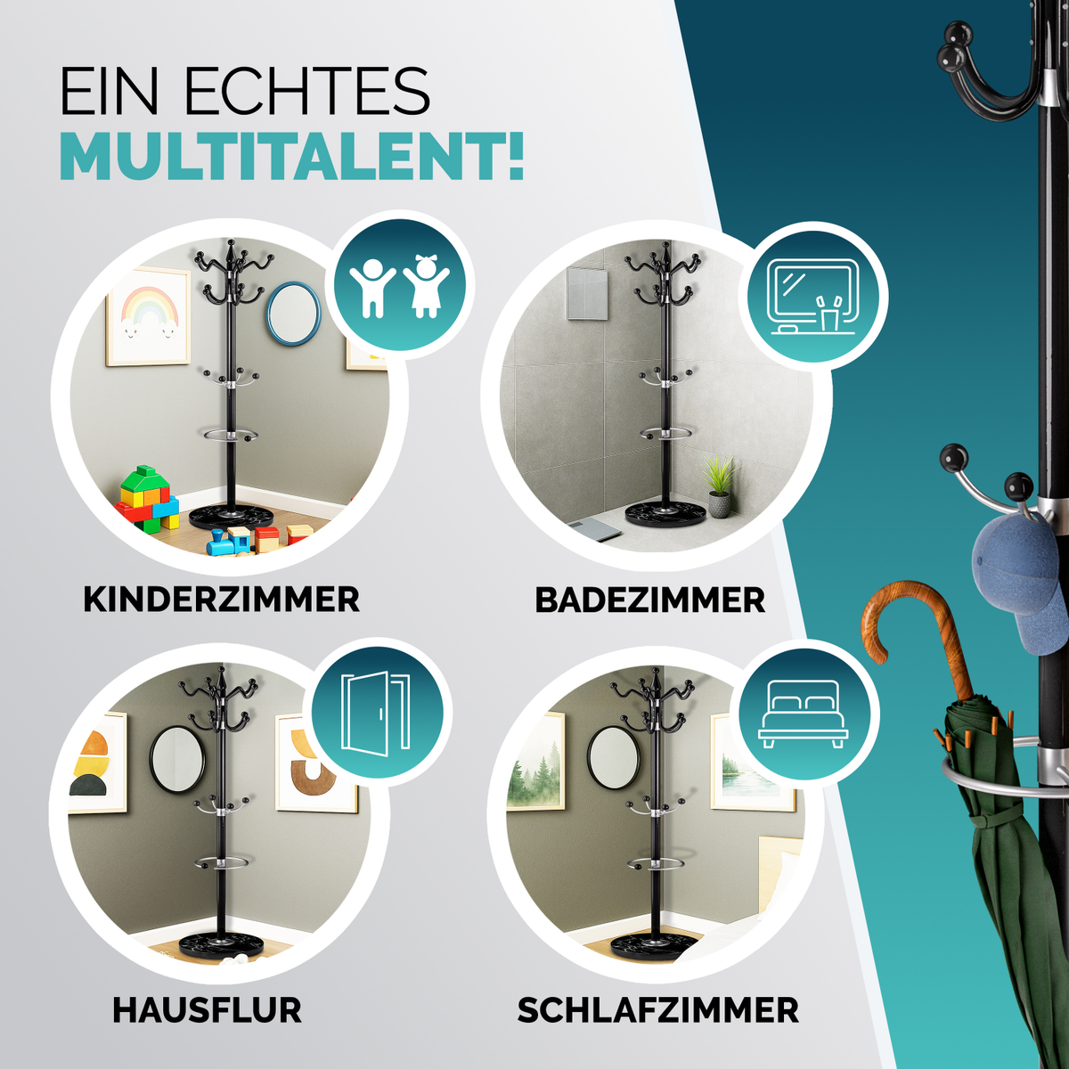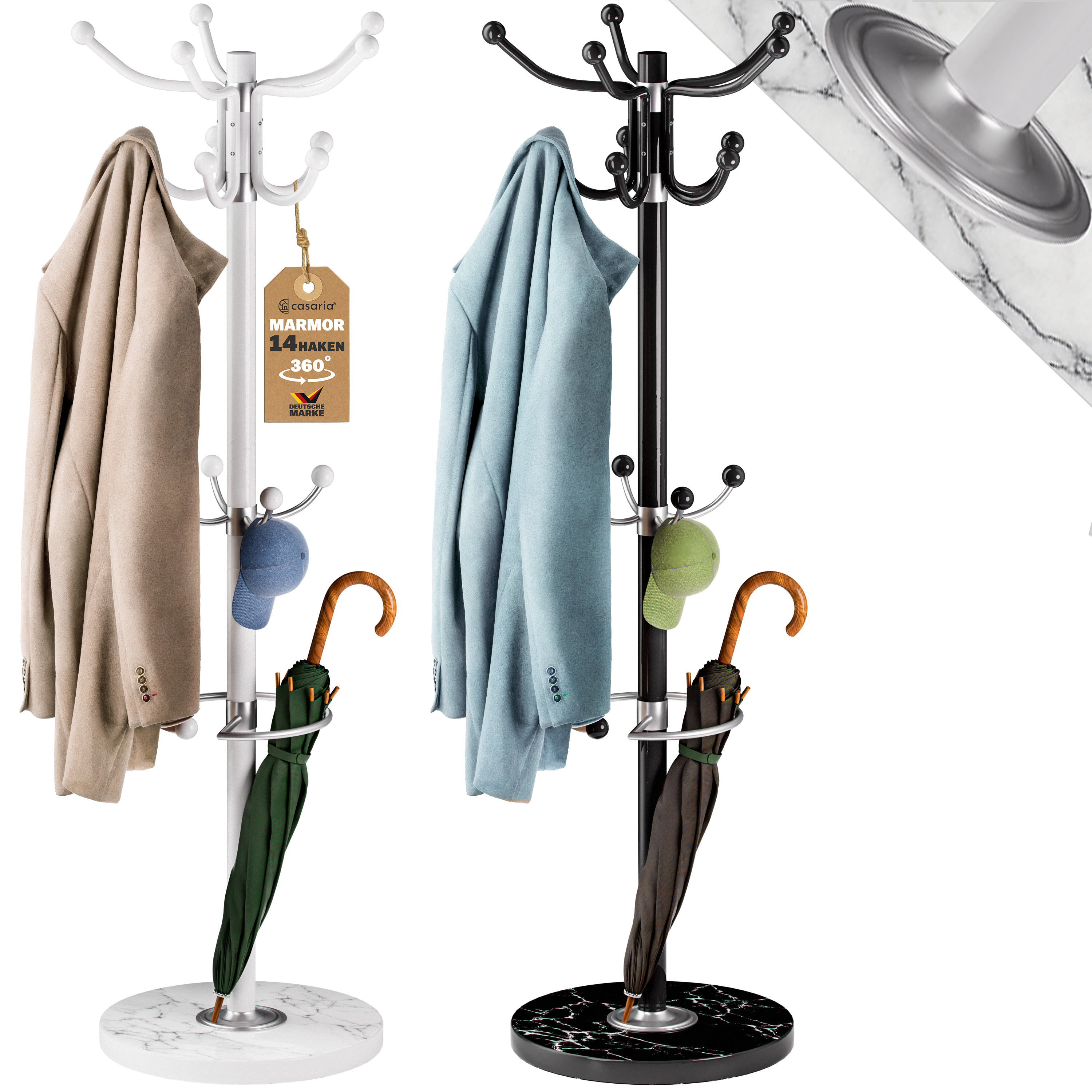 Der Garderobenständer von CASARIA® nutzt mit seinem kompakten Design den Platz im Flur, im Büro oder in kleinen Zimmern optimal aus. 14 Haken auf drei Ebenen bieten viel Stauraum für Jacken, Mäntel oder Mützen. Ein Regenschirmständer macht die Garderobe komplett.