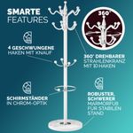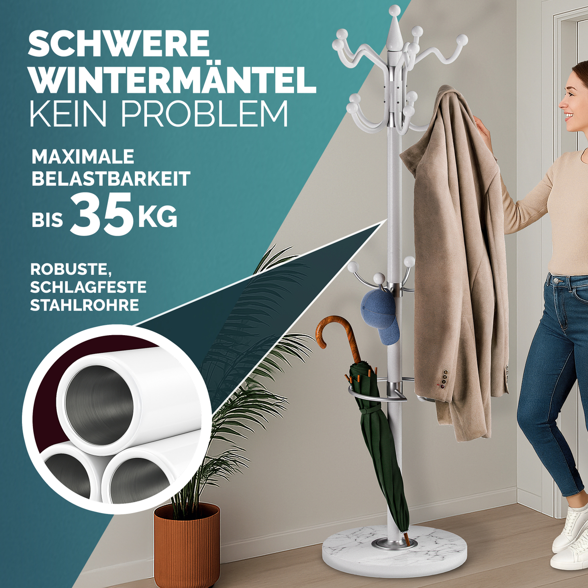 Der schwere Marmor-Sockel mit seiner einzigartigen Maserung hat einen Durchmesser von 37cm, eine Höhe von 2,4cm und sorgt für stabilen Stand. Die Garderobe ist 175cm hoch und bis 35kg belastbar. Sie ist in Weiß oder Schwarz erhältlich, einfach montiert und kann sofort verwendet werden.