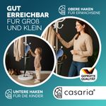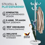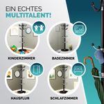 Der obere 5-armige Kranz hat 10 geschwungene Haken und kann um 360° gedreht werden. In der Mitte befinden sich 4 weitere Haken mit Knauf, die auf dieser Höhe besonders gut für Kinder erreichbar sind. Auch Handtaschen und Rucksäcke können hier bequem aufgehängt werden.