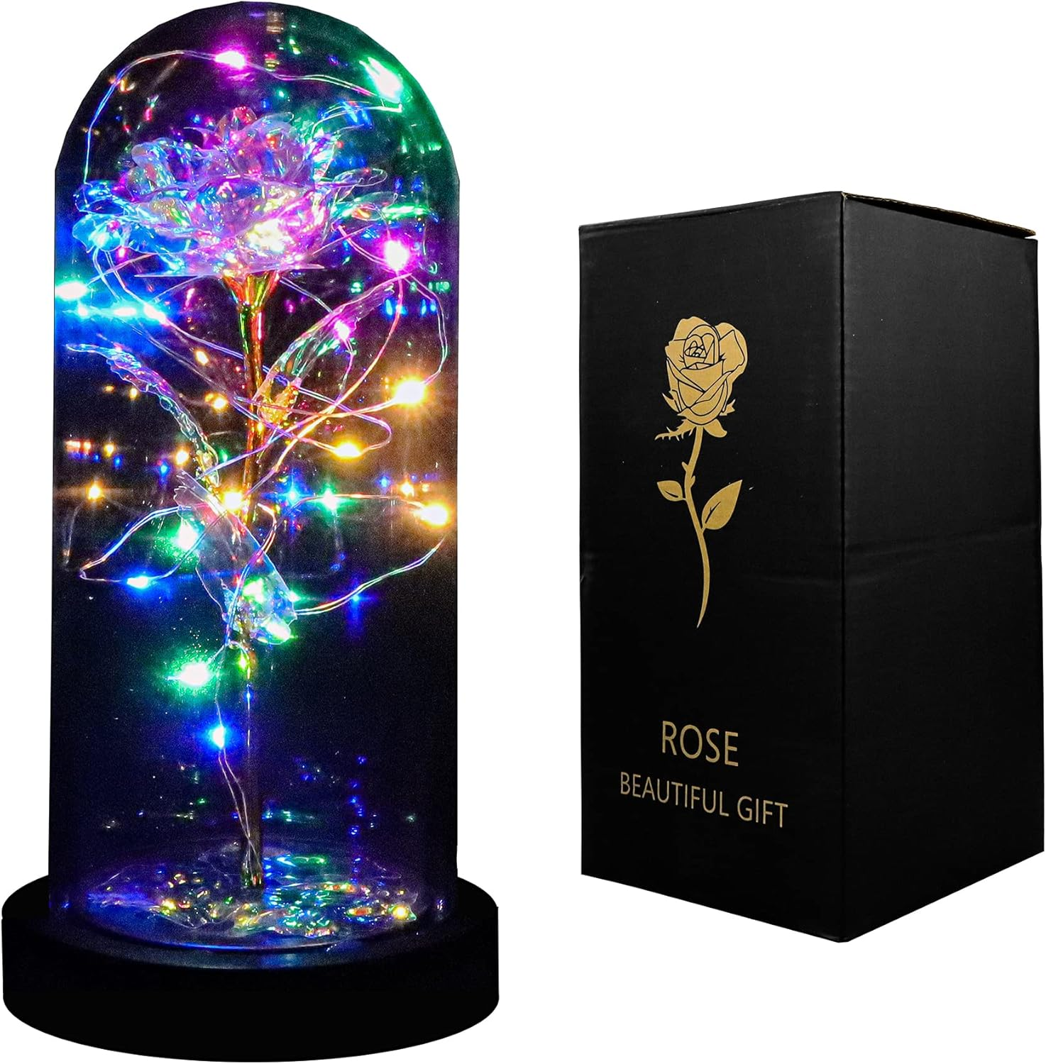 Regalo de flor de rosa artificial arcoíris para ella. La flor de la galaxia se levantó en la bella y la bestia de la cúpula de cristal, para admirar la belleza de la flor de la galaxia desde diferentes ángulos. Los pétalos están incrustados con pequeñas luces LED, simplemente encienda el interruptor de la base y las cálidas luces de colores iluminan toda la cúpula, que se puede utilizar en la decoración de la sala de estar y el dormitorio durante el día y la noche. También puede crear una atmósfera romántica.