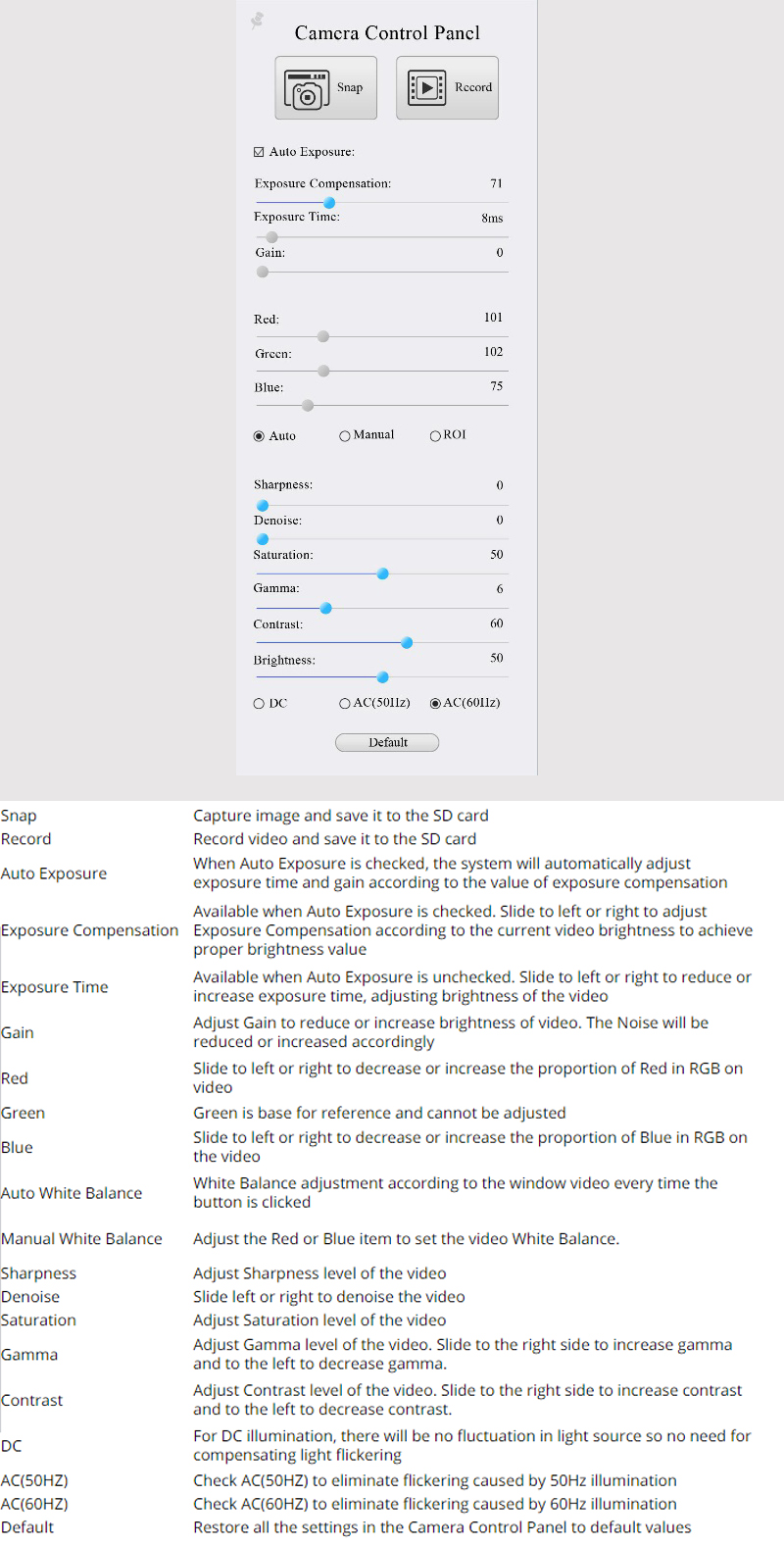 Including Exposure, Gain, White Balance, Color Adjustment, Sharpness and Denoising Control |