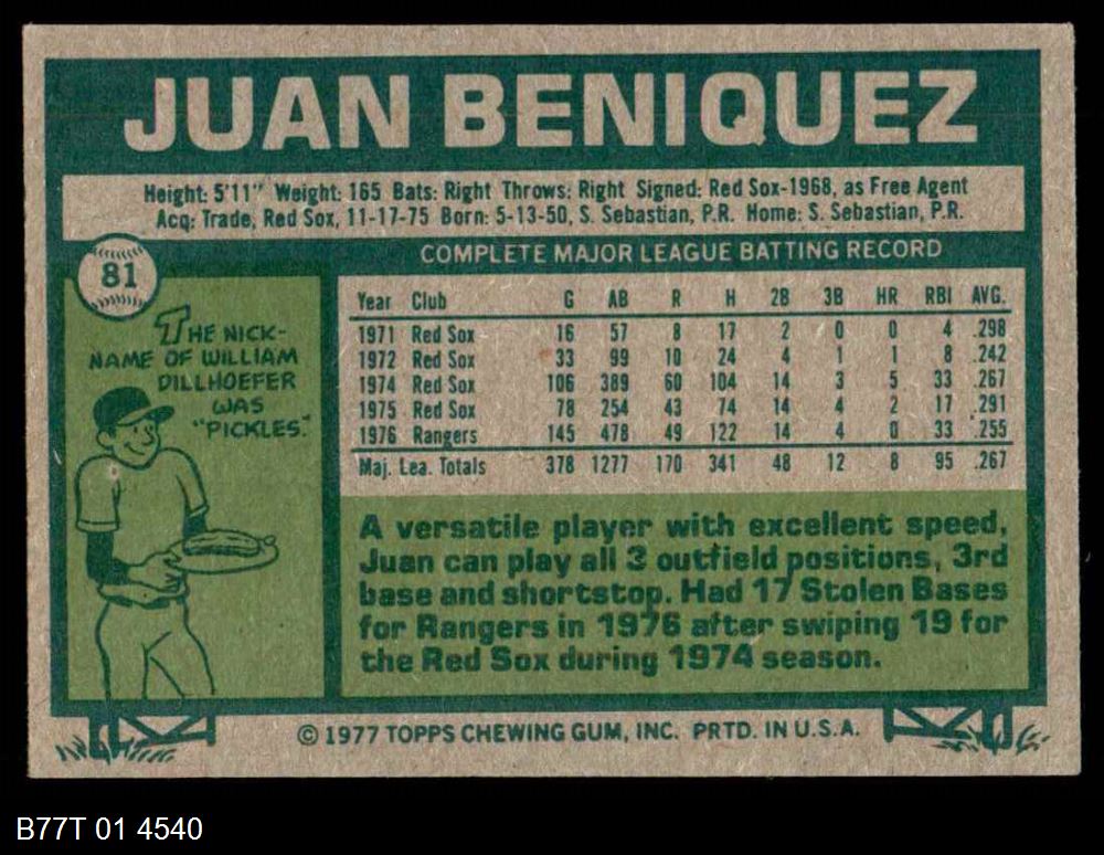 | 1977 Topps #81 Juan Beniquez | 4 - VG/EX | Front | Back |