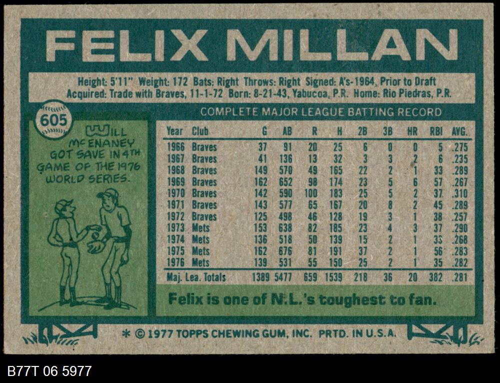 | 1977 Topps #605 Felix Millan | 4 - VG/EX | Front | Back |