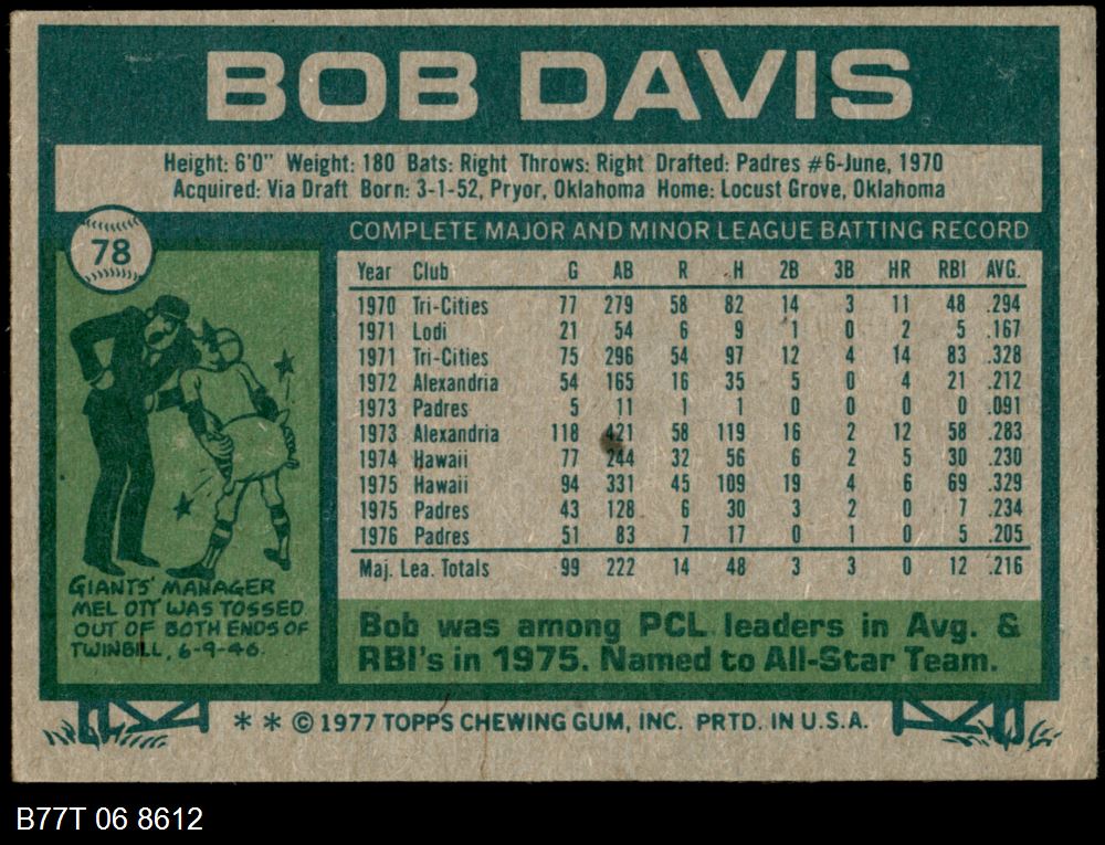 | 1977 Topps #78 Bob Davis | 4 - VG/EX | Front | Back |