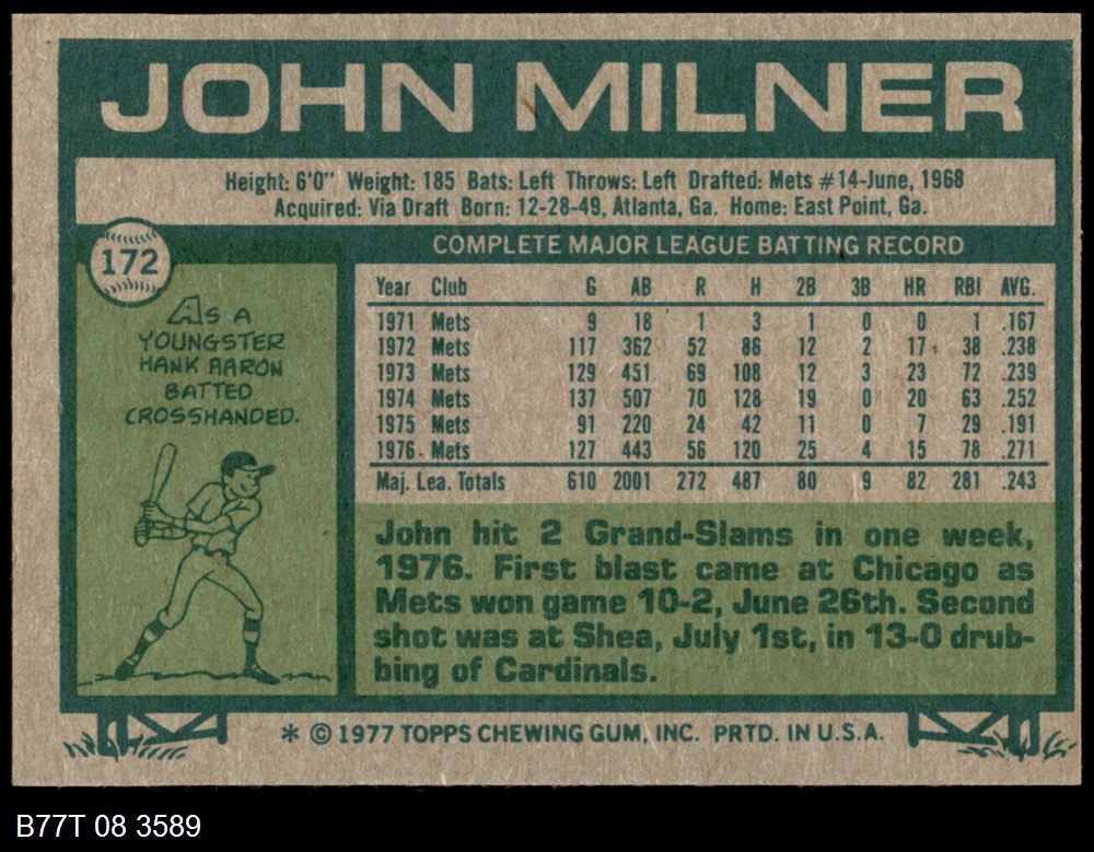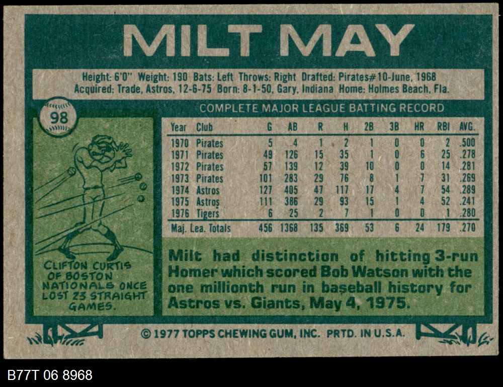 | 1977 Topps #98 Milt May | 3 - VG | Front | Back |
