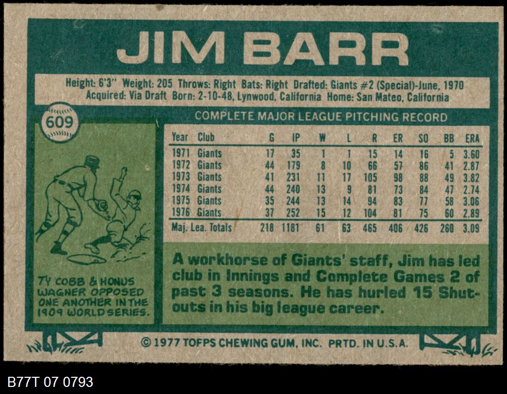 | 1977 Topps #609 Jim Barr | 4 - VG/EX | Front | Back |