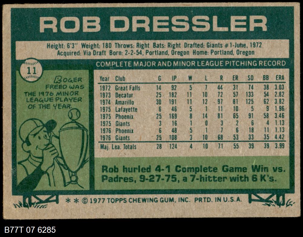 | 1977 Topps #11 Rob Dressler | 3 - VG | Front | Back |