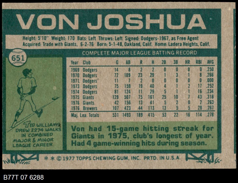 | 1977 Topps #651 Von Joshua | 4 - VG/EX | Front | Back |