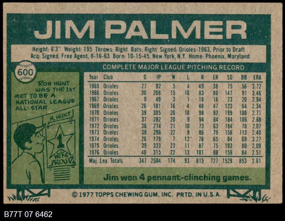| 1977 Topps #600 Jim Palmer | 3 - VG | Front | Back |