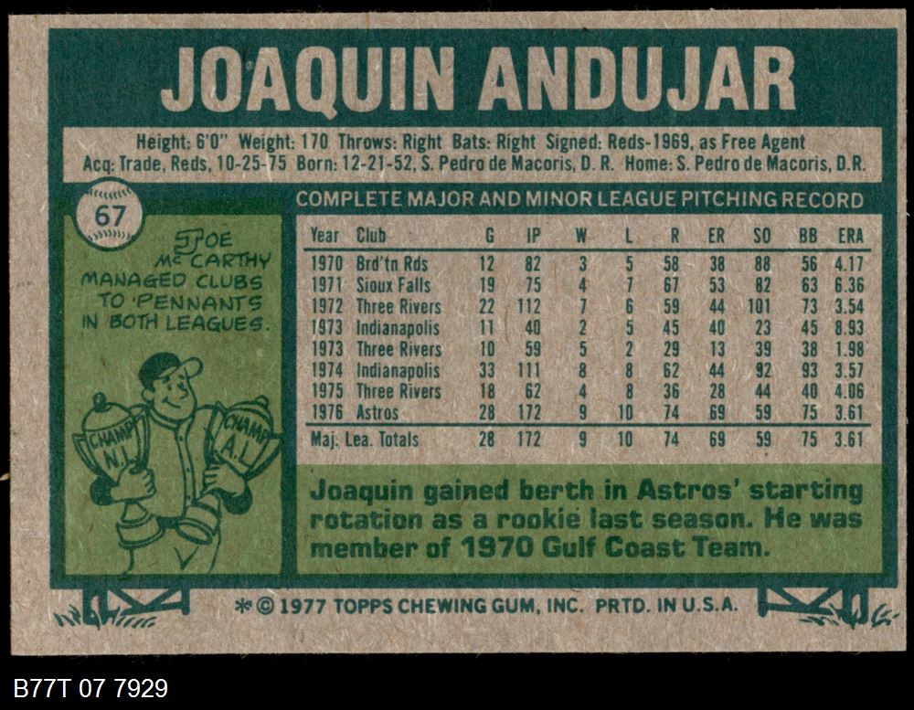 | 1977 Topps #67 Joaquin Andujar | 5 - EX | Front | Back |