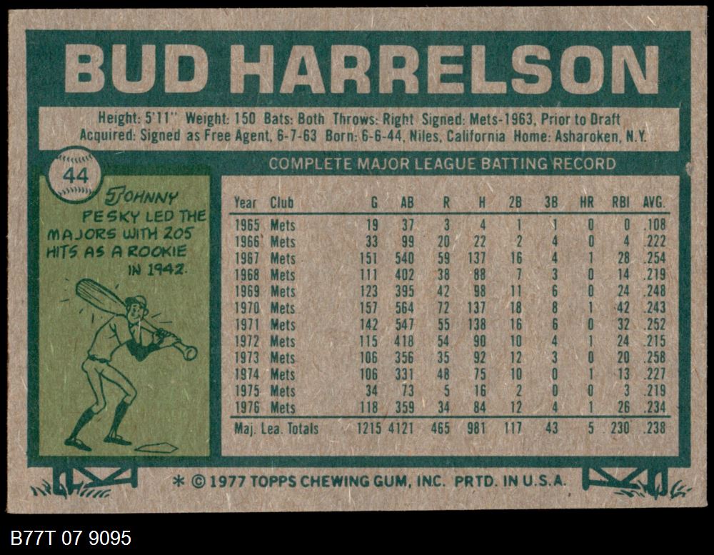| 1977 Topps #44 Bud Harrelson | 3 - VG | Front | Back |