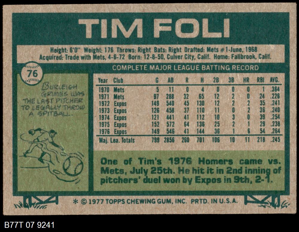 | 1977 Topps #76 Tim Foli | 4 - VG/EX | Front | Back |