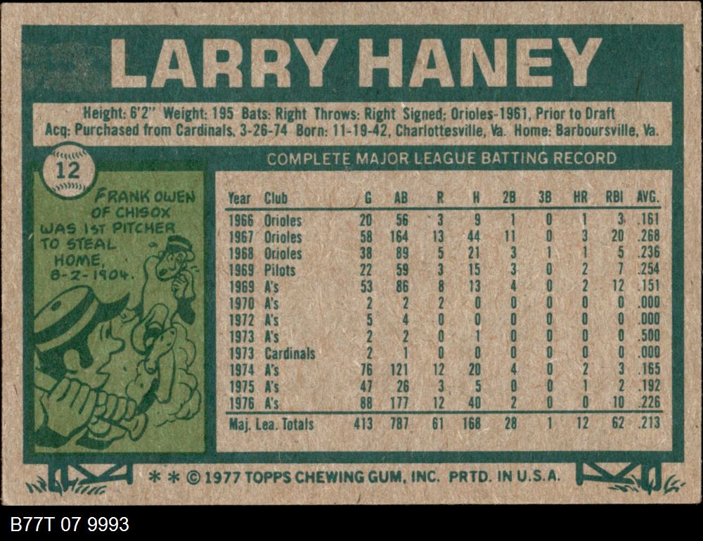 | 1977 Topps #12 Larry Haney | 4 - VG/EX | Front | Back |