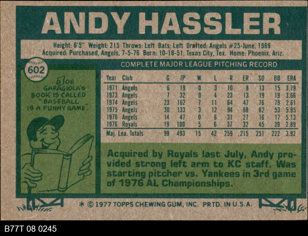 | 1977 Topps #602 Andy Hassler | 5 - EX | Front | Back |