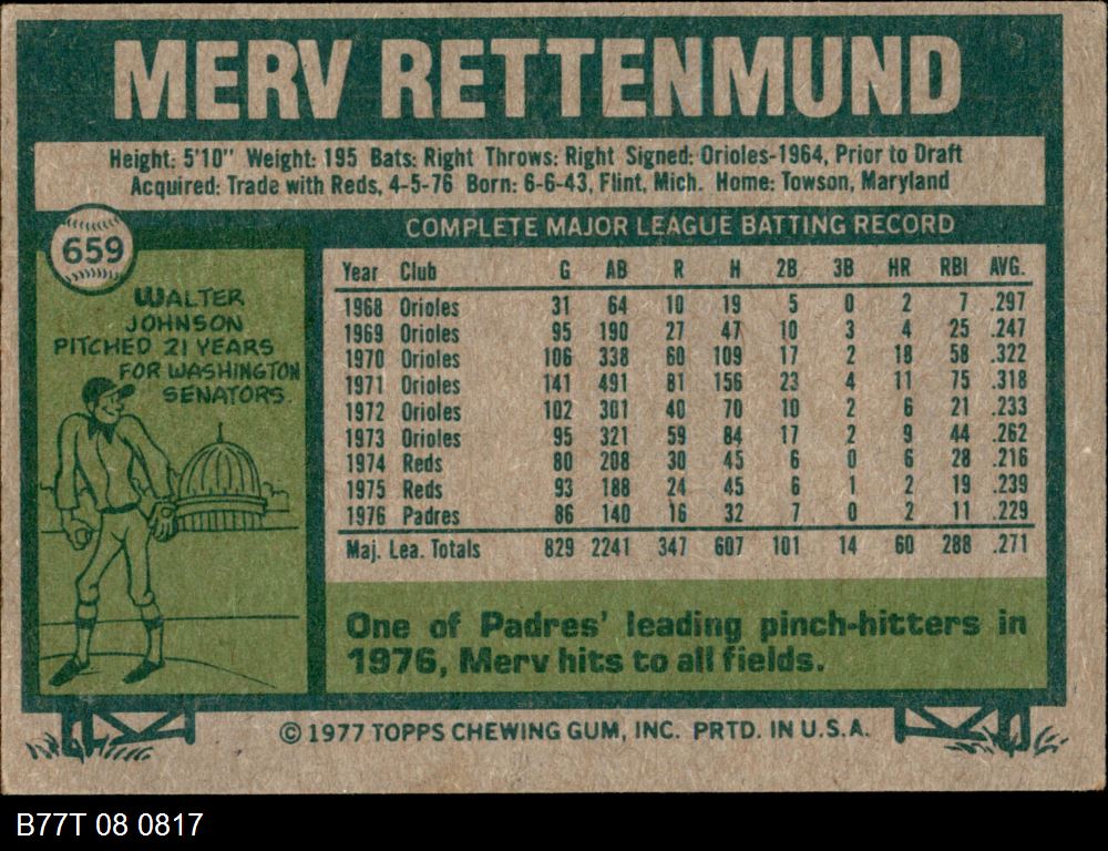 | 1977 Topps #659 Merv Rettenmund | 4 - VG/EX | Front | Back |