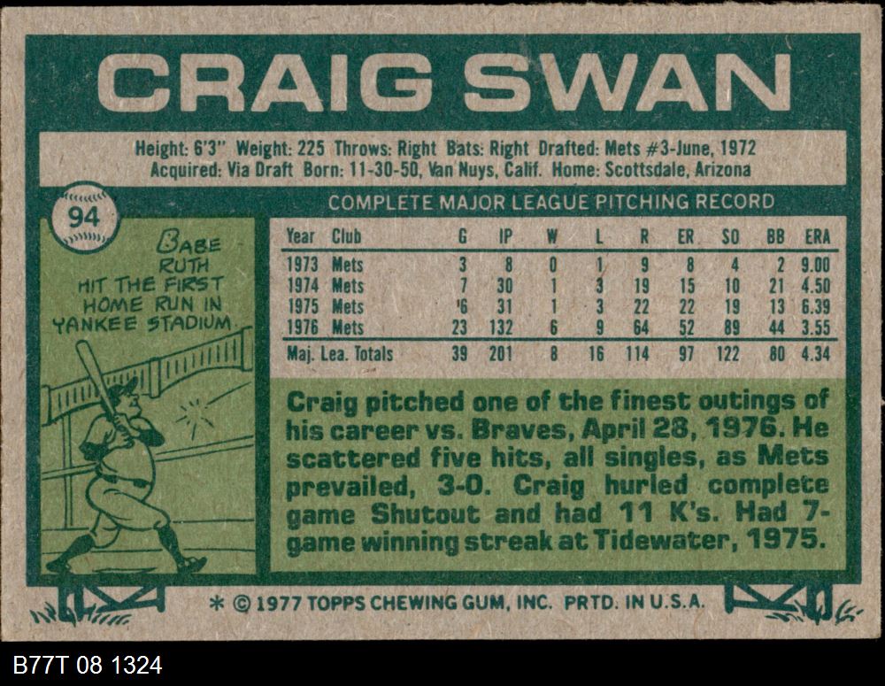 | 1977 Topps #94 Craig Swan | 4 - VG/EX | Front | Back |