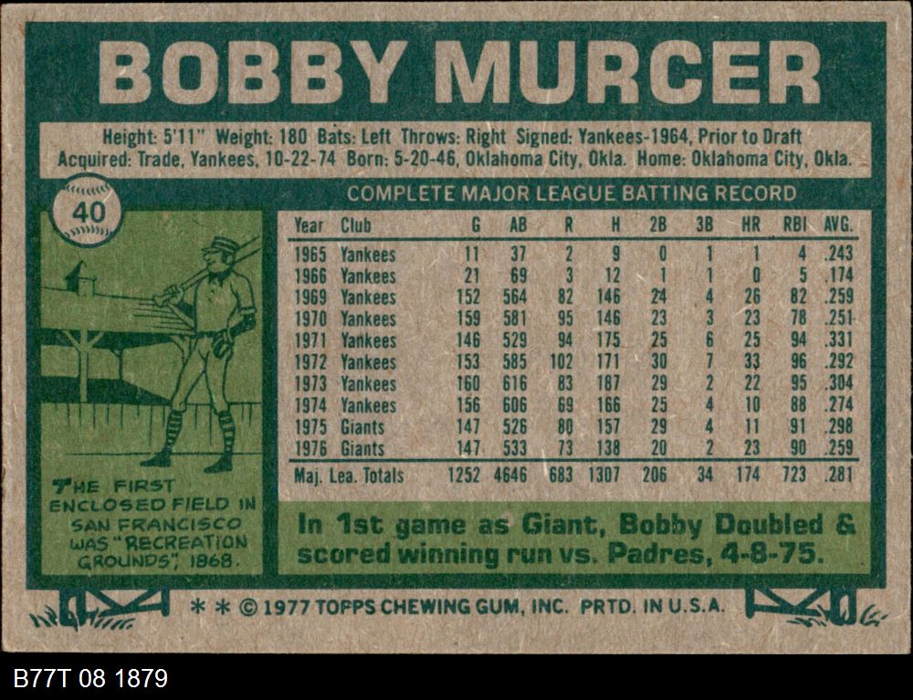 | 1977 Topps #40 Bobby Murcer | 4 - VG/EX | Front | Back |