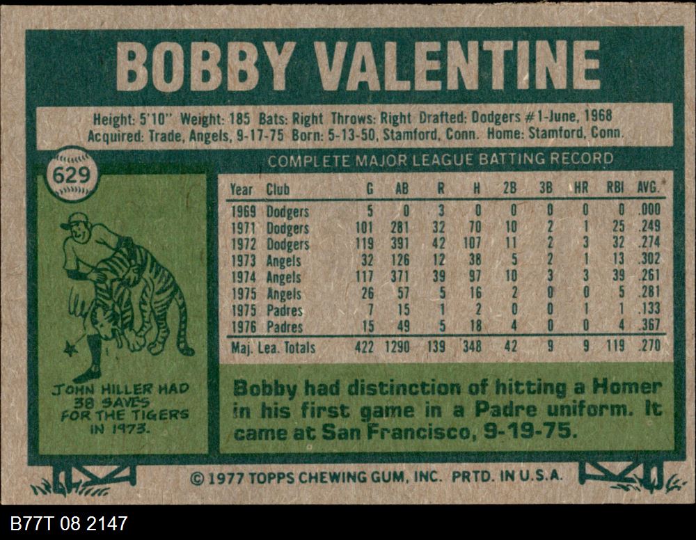 | 1977 Topps #629 Bobby Valentine | 3 - VG | Front | Back |