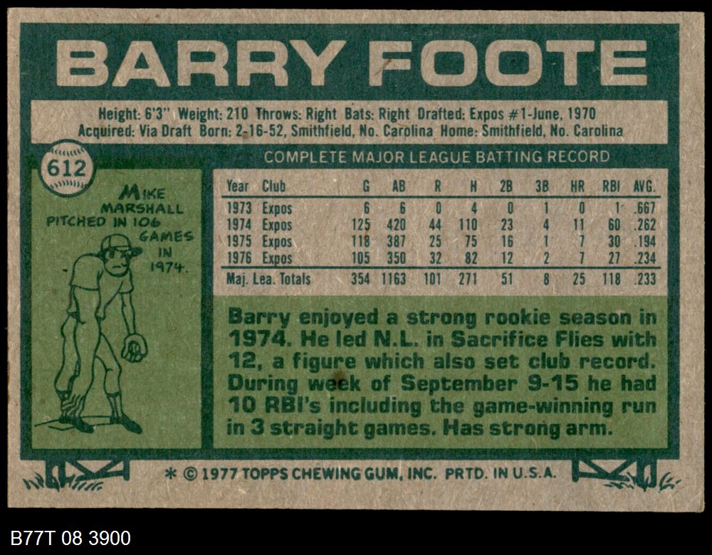 | 1977 Topps #612 Barry Foote | 5 - EX | Front | Back |