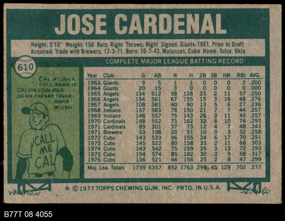 | 1977 Topps #610 Jose Cardenal | 3 - VG | Front | Back |