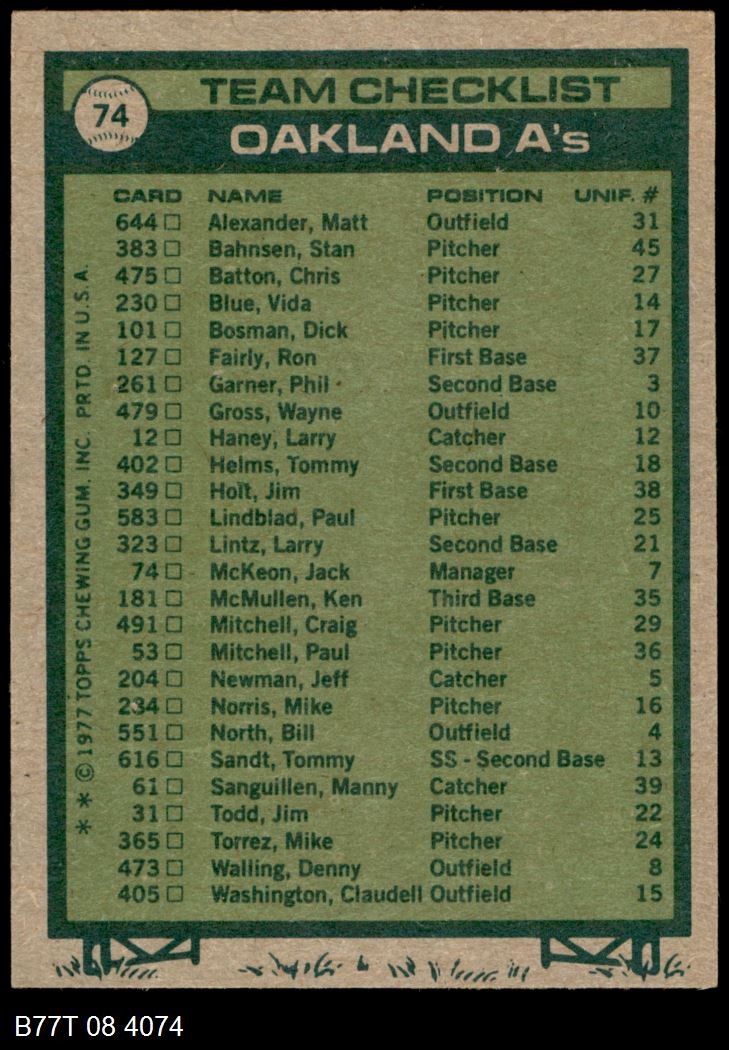 | 1977 Topps #74 Jack McKeon A's Team Checklist | 4 - VG/EX | Front | Back |