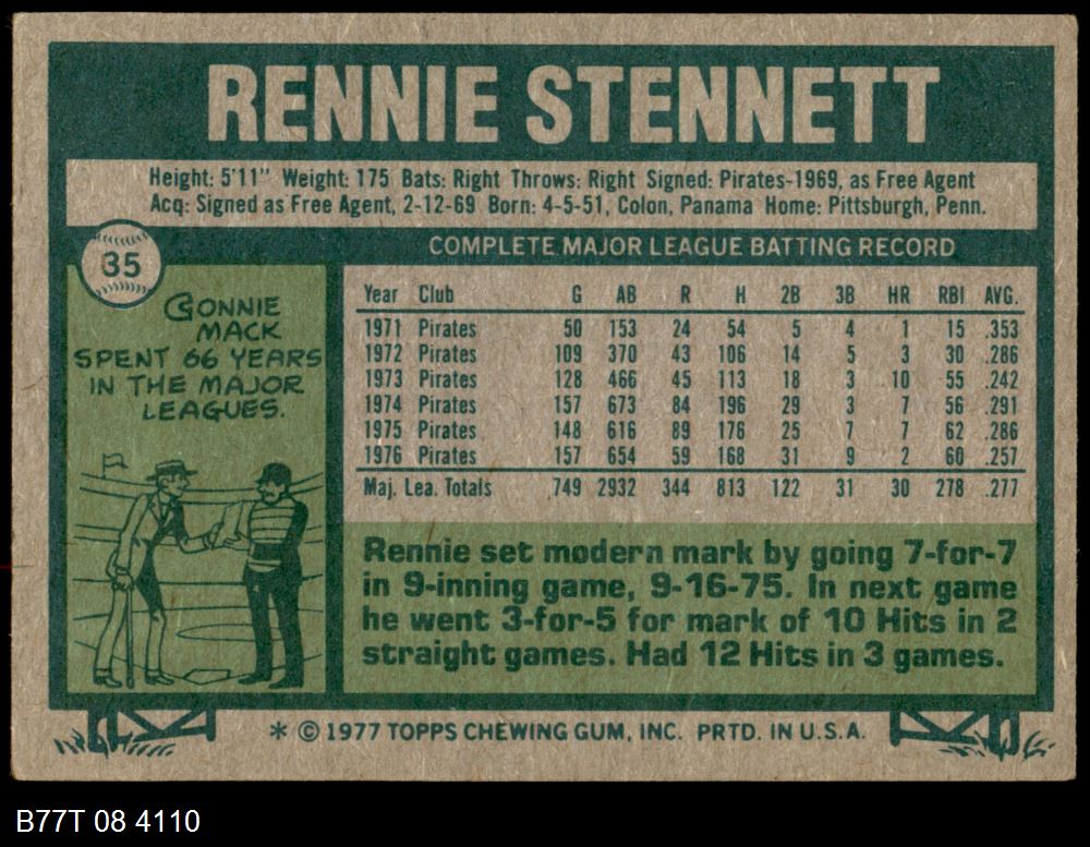 | 1977 Topps #35 Rennie Stennett | 4 - VG/EX | Front | Back |