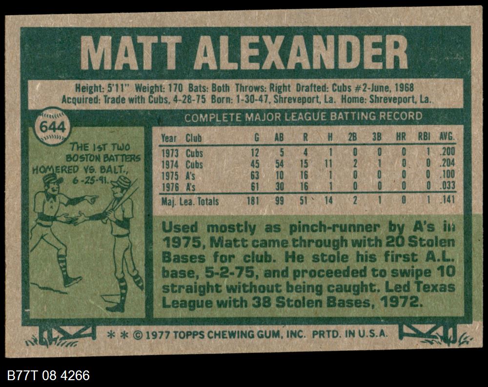 | 1977 Topps #644 Matt Alexander | 4 - VG/EX | Front | Back |