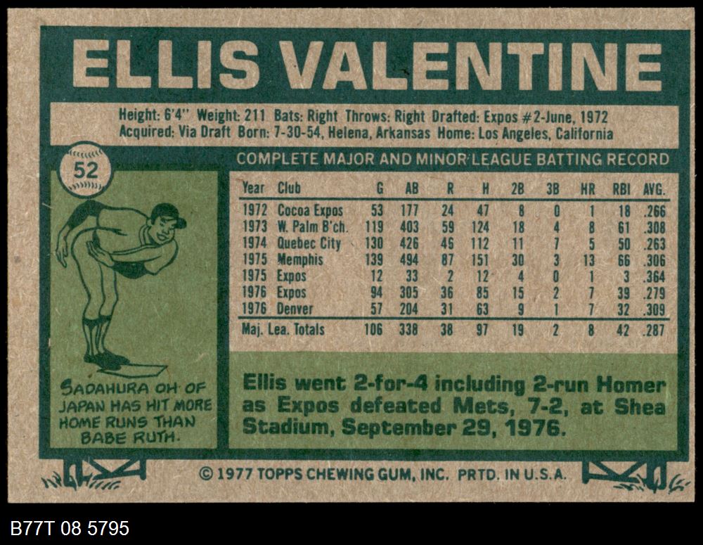 | 1977 Topps #52 Ellis Valentine | 4 - VG/EX | Front | Back |