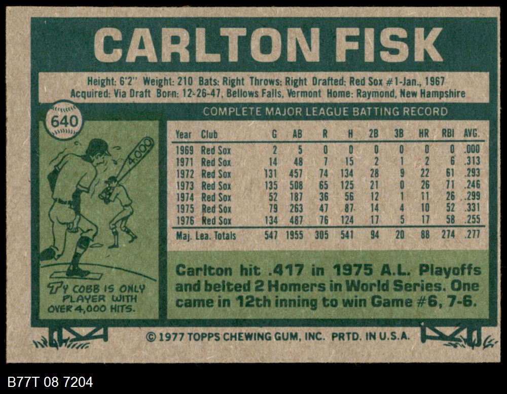 | 1977 Topps #640 Carlton Fisk | 4 - VG/EX | Front | Back |