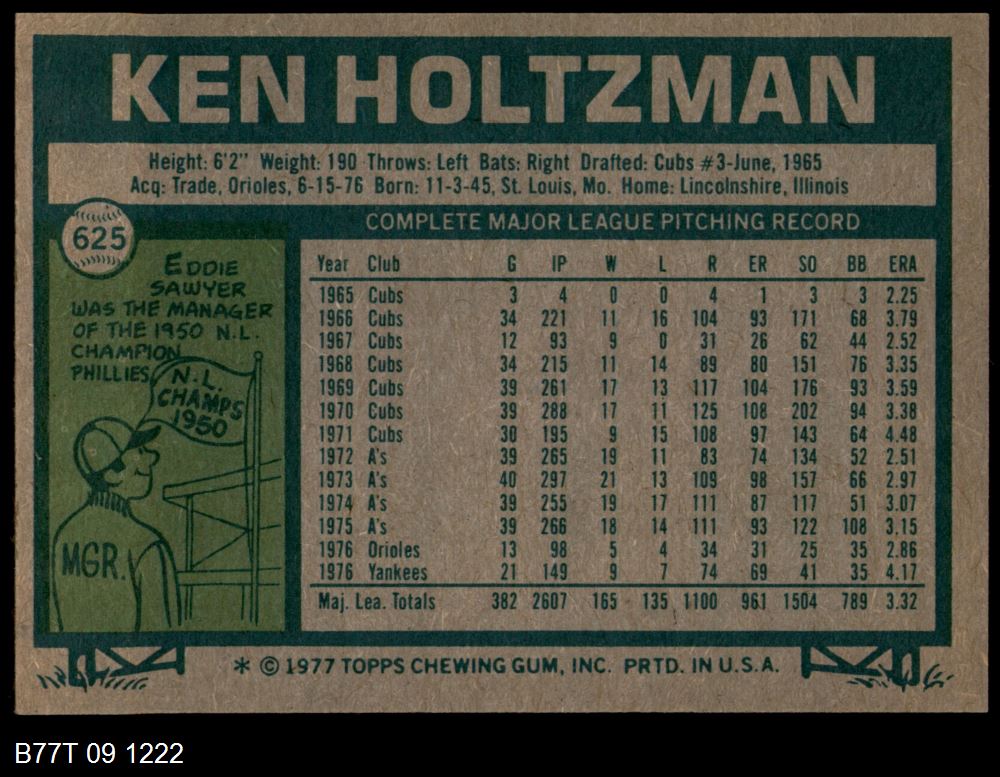 | 1977 Topps #625 Ken Holtzman | 5 - EX | Front | Back |