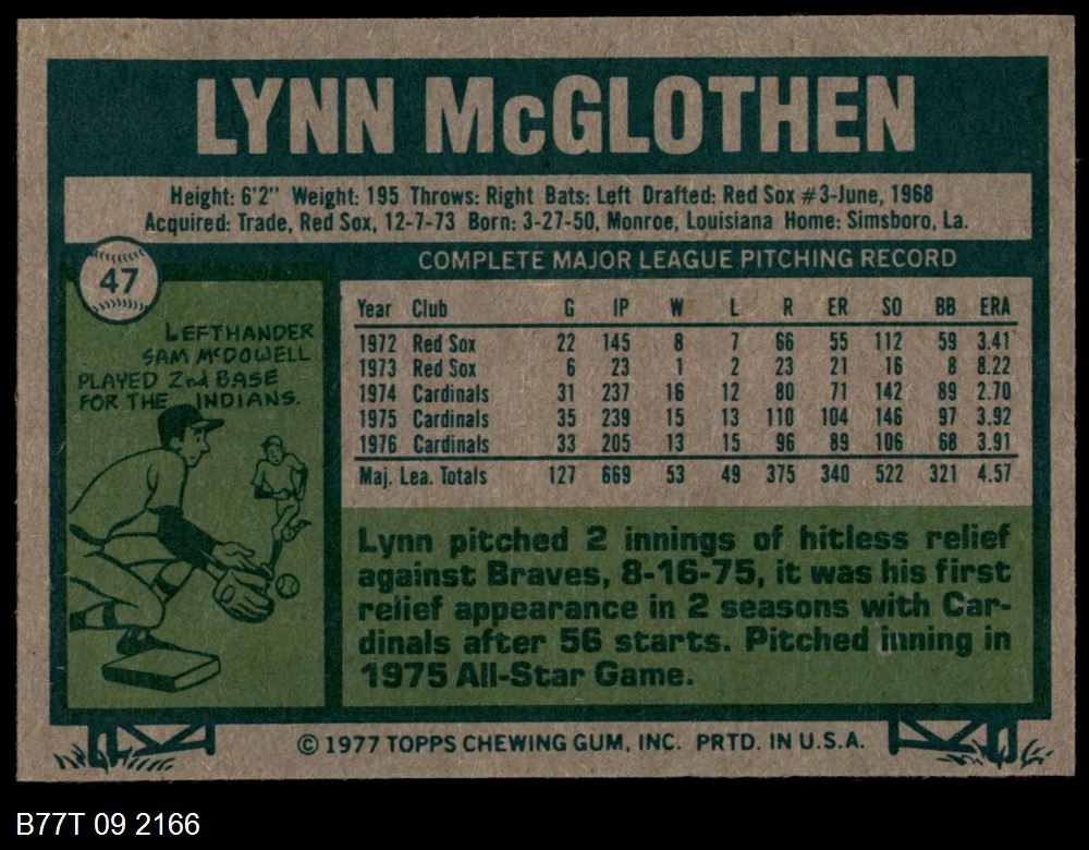 | 1977 Topps #47 Lynn McGlothen | 4 - VG/EX | Front | Back |