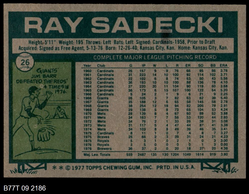 | 1977 Topps #26 Ray Sadecki | 4 - VG/EX | Front | Back |